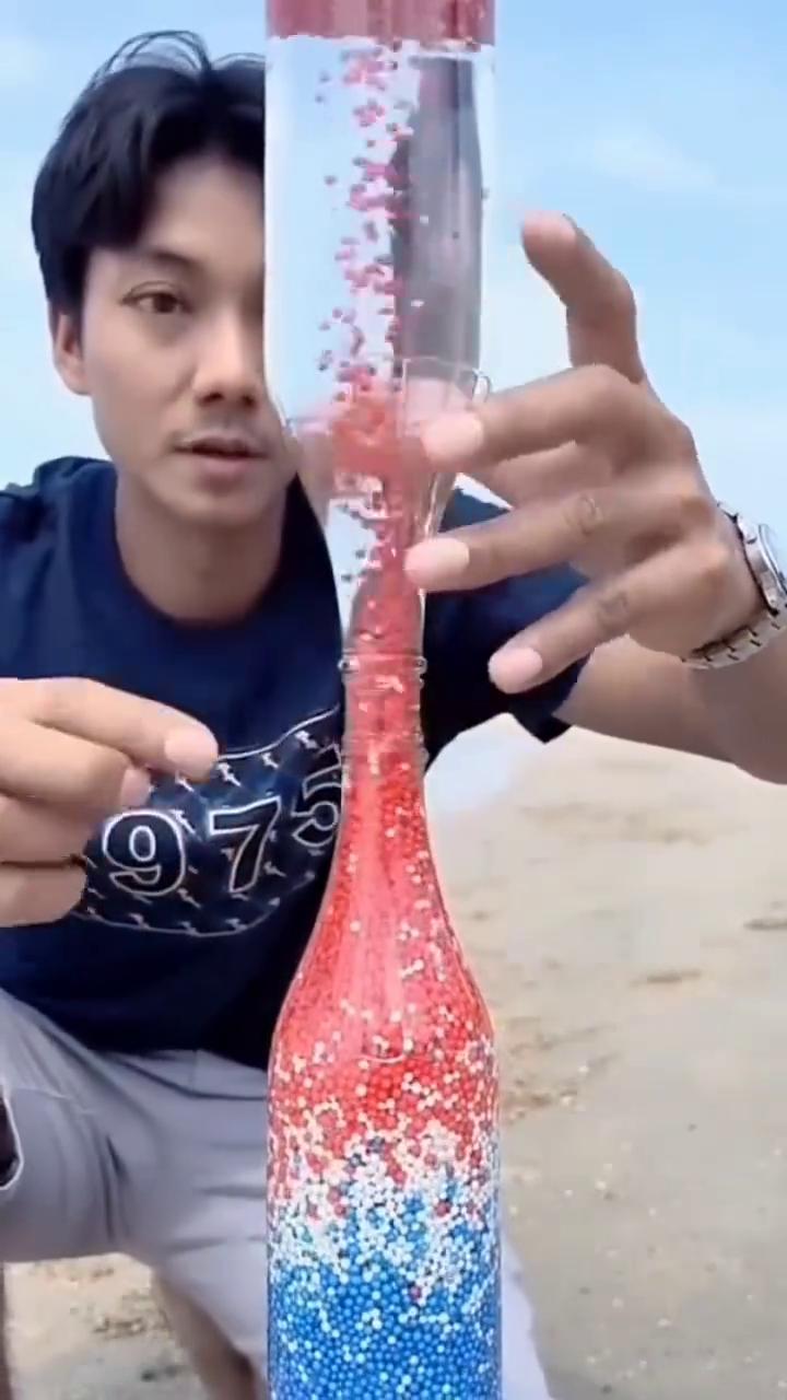 家人们看看倒流,下边这瓶全是颗粒,小伙让它全部上上面这瓶的,你看他是怎么做到的。