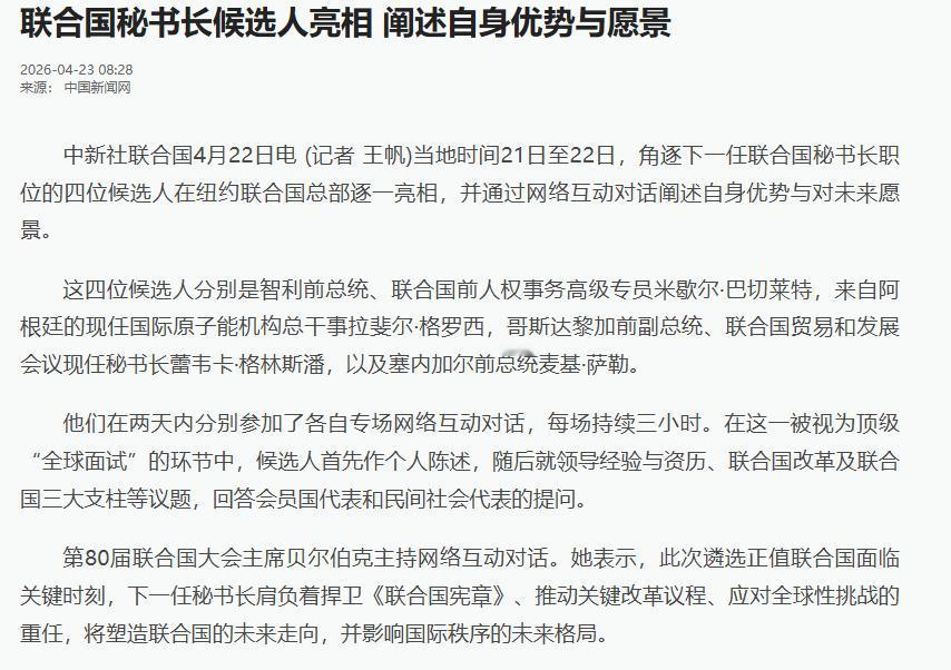 这场大选,表面上是四个人在争,背后其实是几大势力在掰手腕。美国想推自己可控的人,中国和俄罗斯则要确保秘书长不能损害自身利益,更不能成为某个大国的“传声筒”。