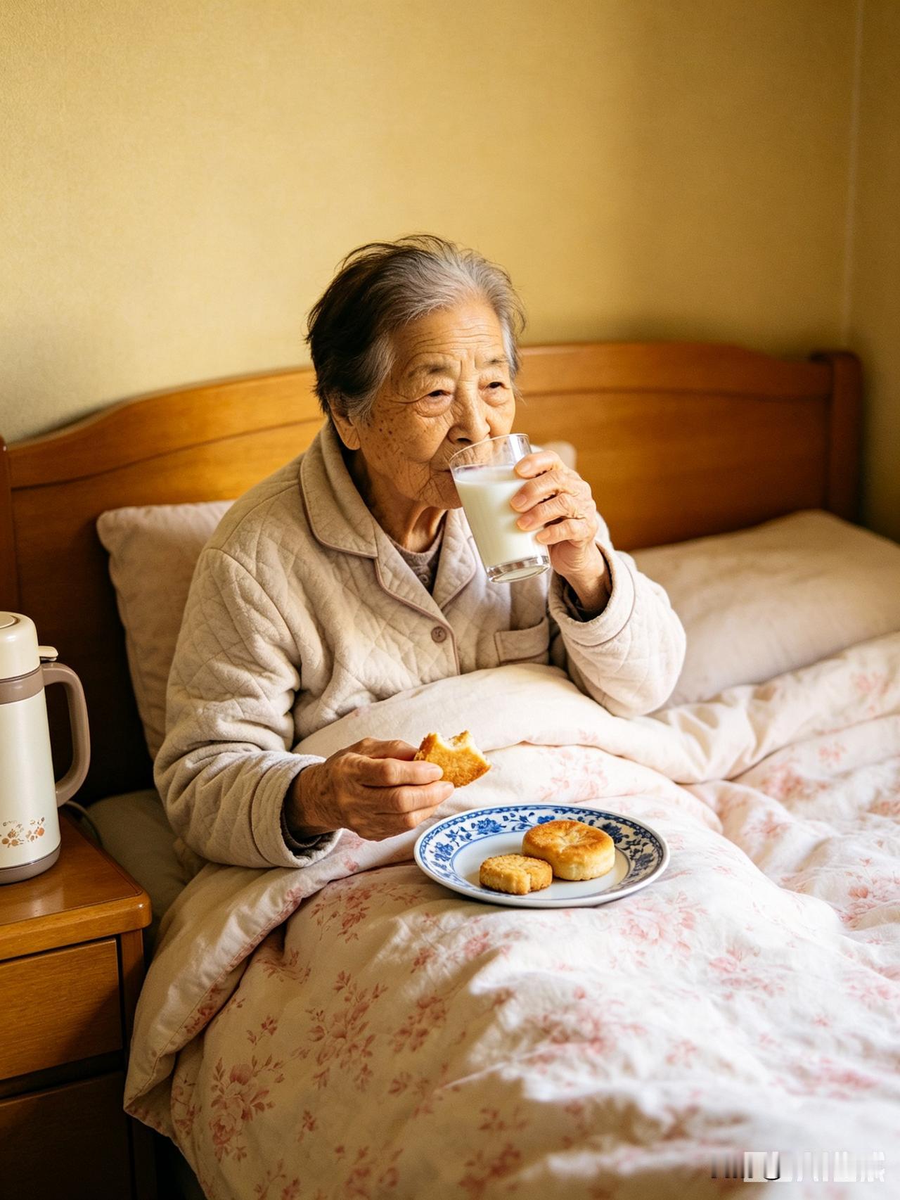 睡觉的时候老太太也要吃东西,她闭着眼睛把吃的塞到嘴里咀嚼吞咽,喝牛奶,喝鸡汤鱼汤,吃饱喝足完事继续睡。