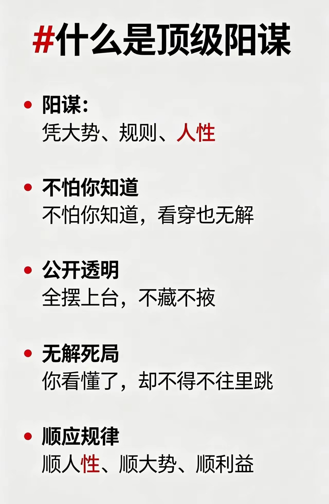 阳谋:凭大势、规则、人性不怕你知道,看穿也无解公开透明全摆上台,不藏不掖无解死局你看懂了,却不得不往里跳顺应规律顺人性、顺大势、顺利益
