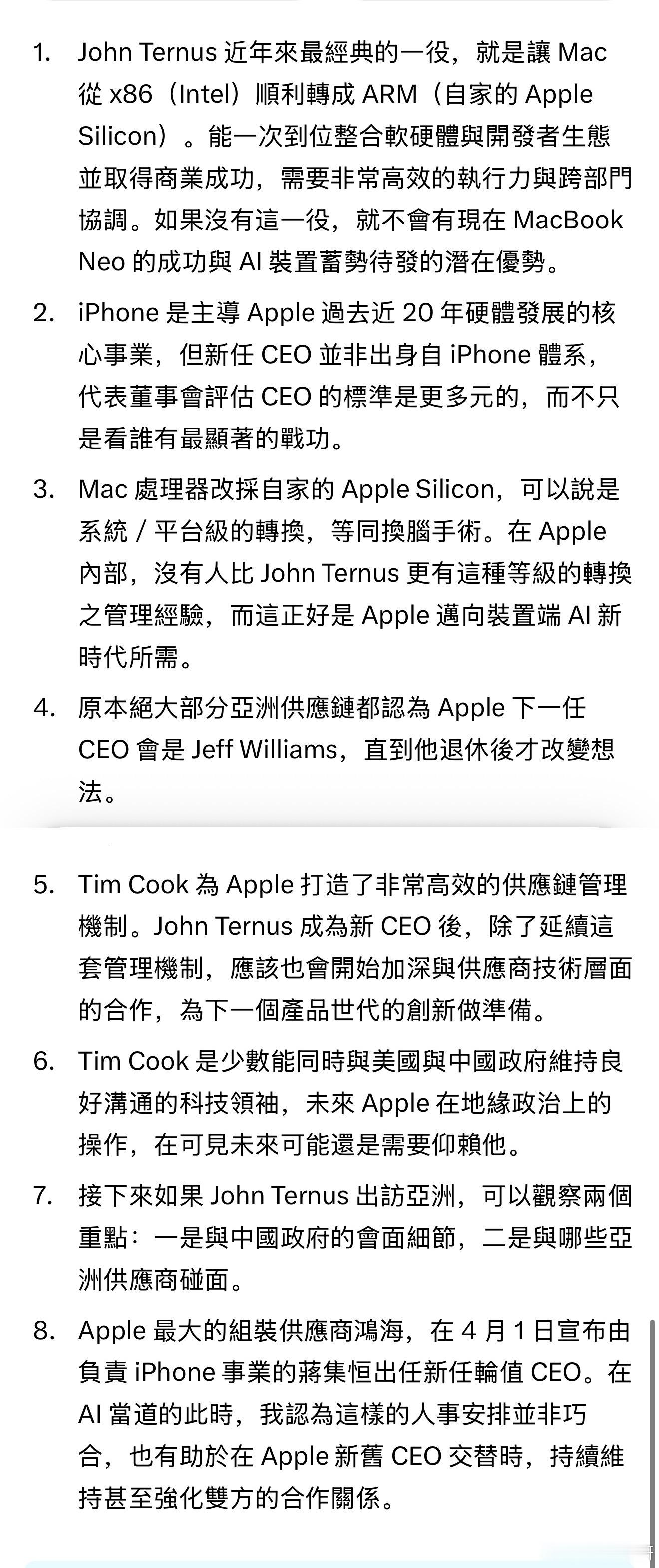 如果John Ternus到访亚洲,有两大关注点值得留意:一是他与中国官方沟通的具体内容;二是他会面的亚洲供应链合作厂商名单。