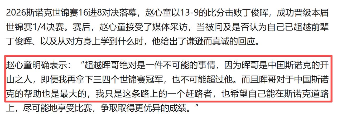不得不说,赵心童的三观是真正。他说,即便自己再拿下三四个世锦赛冠军,也超越不了丁俊晖。