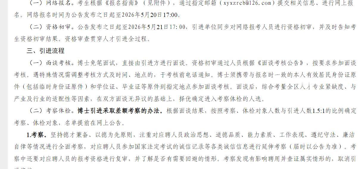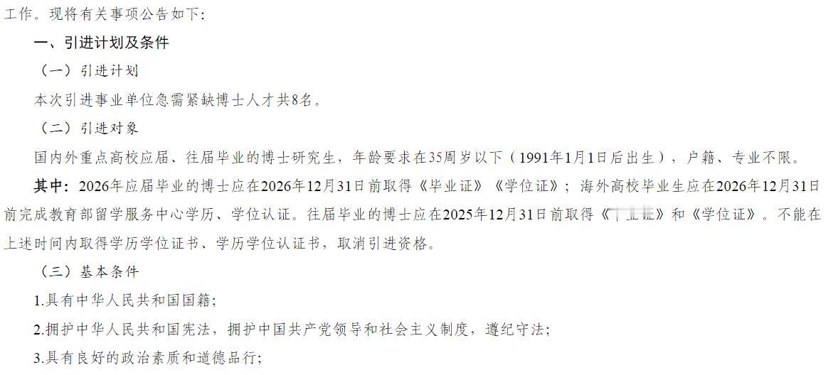 2026年襄阳市襄州区引进事业单位 急需紧缺博士人才8名,国内外重点高校应届、往届毕业的博士研究生,年龄要求在35周岁以下(1991年1月1日后出生),户籍、专业不限。网络报名时间为公告发布之日起至2026年5月20日17:00。