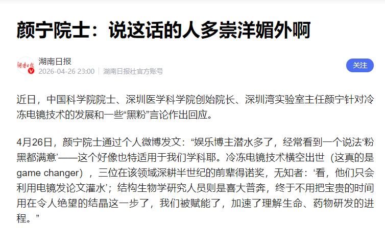 4月26号,颜宁发微博说,她平时也看娱乐博主,常听到“粉黑都满意”这话,没想到科研圈也这样。她重点说俩事,都是科研界的大突破,却被无知的人乱解读。