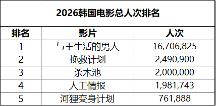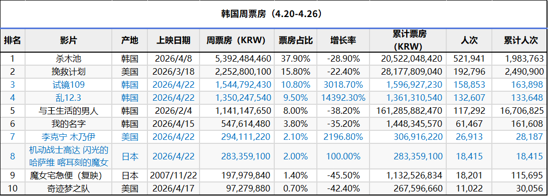 2026年第17周韩国票房 :1. 恐怖片《杀木池》三连冠,观影人次突破200万;2. 《挽救计划》跌幅依旧保持较小,累计观影人次249万;3. 正宇、郑秀晶主演电影《试镜109》在新片中表现最佳。(数据:韩国电影振兴委员会)