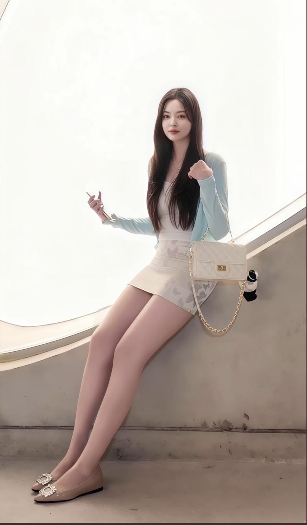 浅蓝短款针织开衫温柔又有呼吸感,搭配修身内搭刚好平衡了松弛与利落;高腰蝴蝶印花短裙悄悄拉高腰线,把腿部线条衬得又直又长。同色系的精致平底鞋和简约白包,在细节里悄悄加分,整套搭配清新又显气质,日常穿舒服又亮眼。