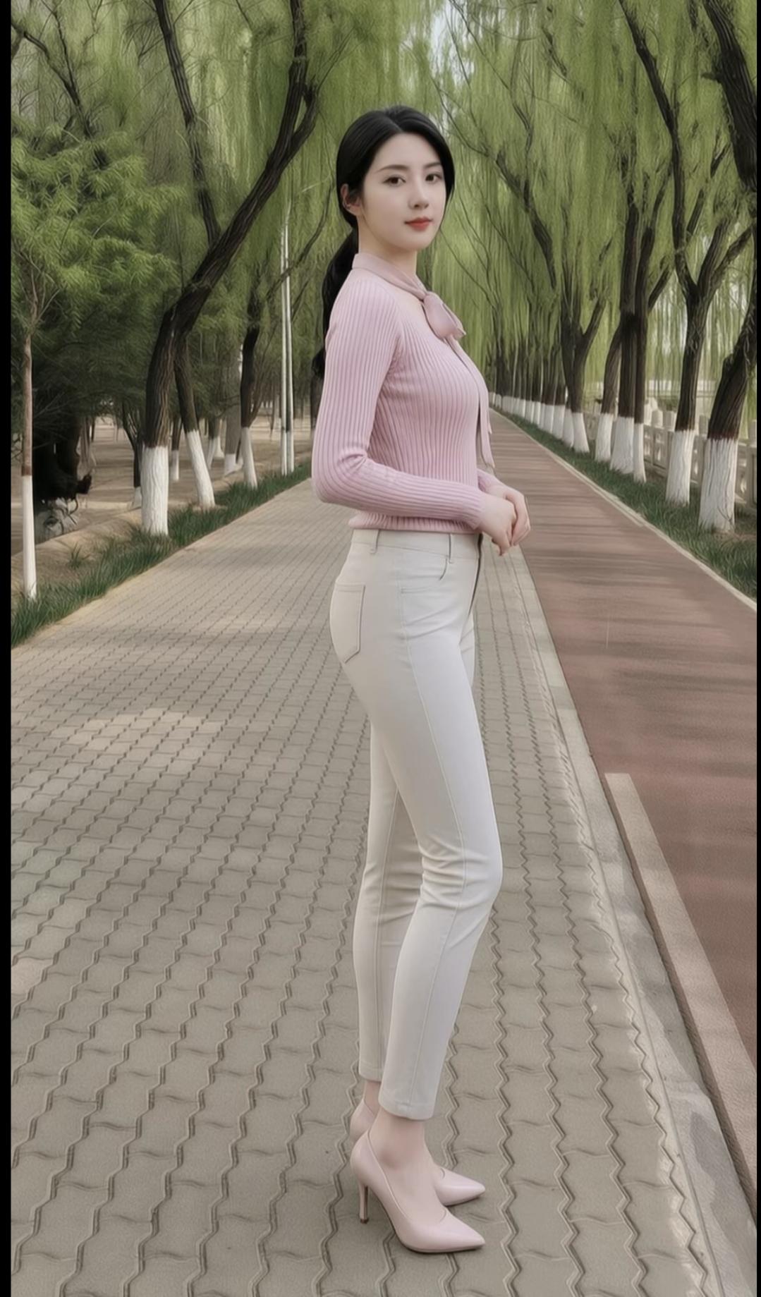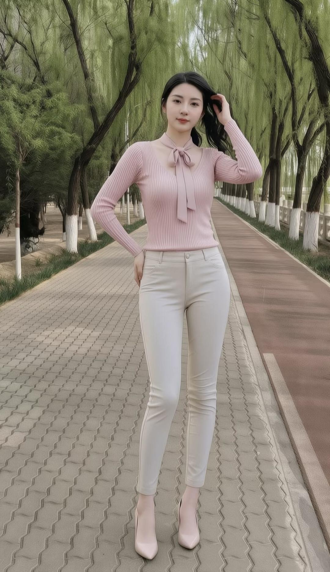 淡粉色系带针织衫自带温柔滤镜,领部的蝴蝶结细节悄悄添了几分精致感,竖坑条纹理还能悄悄修饰上半身线条;搭配米白色高腰紧身裤,利落的剪裁把腰臀比例衬得恰到好处,浅色系也完全没有沉闷感。同色系的尖头高跟鞋拉长了腿部线条,整套搭配温柔又有力量,既保留了知性优雅的气质,又把好身材的优势展现得淋漓尽致。