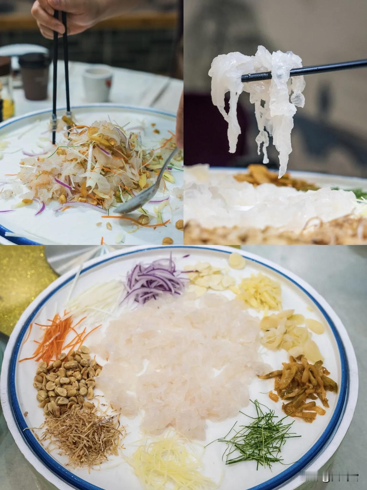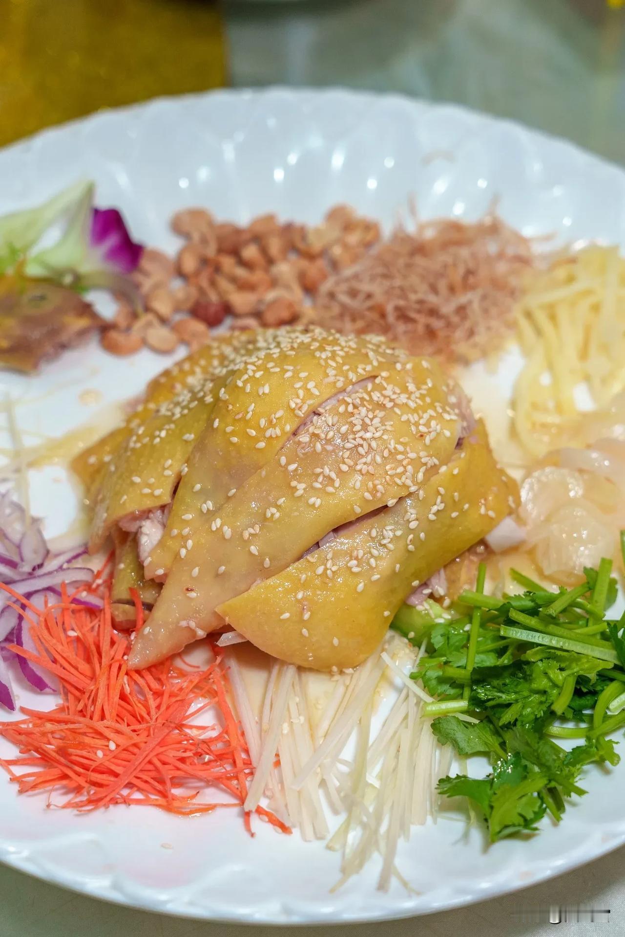 延续了“捞起”的好意头。手撕鸡肉嫩滑,搭配葱丝、香菜、洋葱等,拌匀后咸鲜清爽,与鱼生有异曲同工之妙