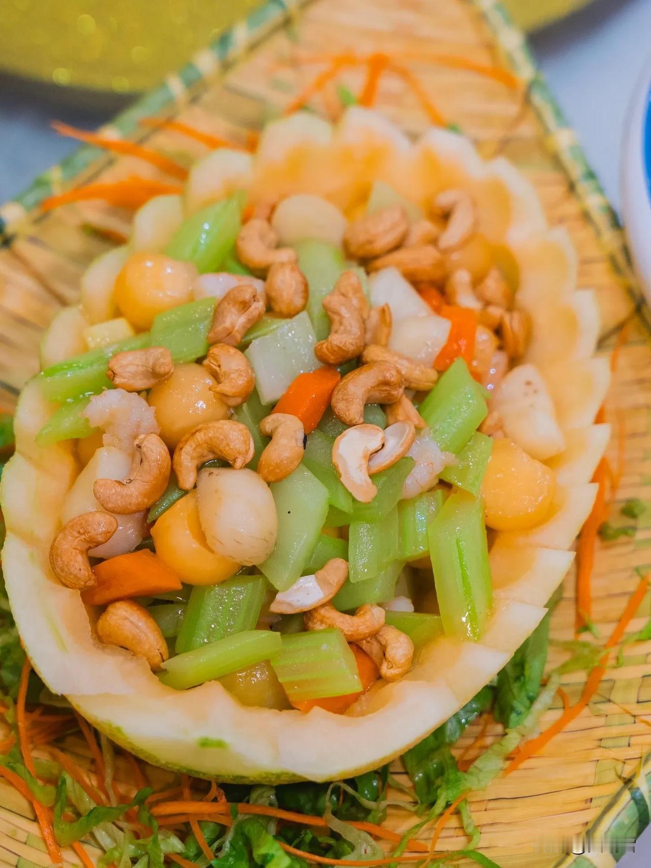 蜜瓜挖成船形,盛着清甜果肉,在浓烈荤菜之后送来一缕清新
