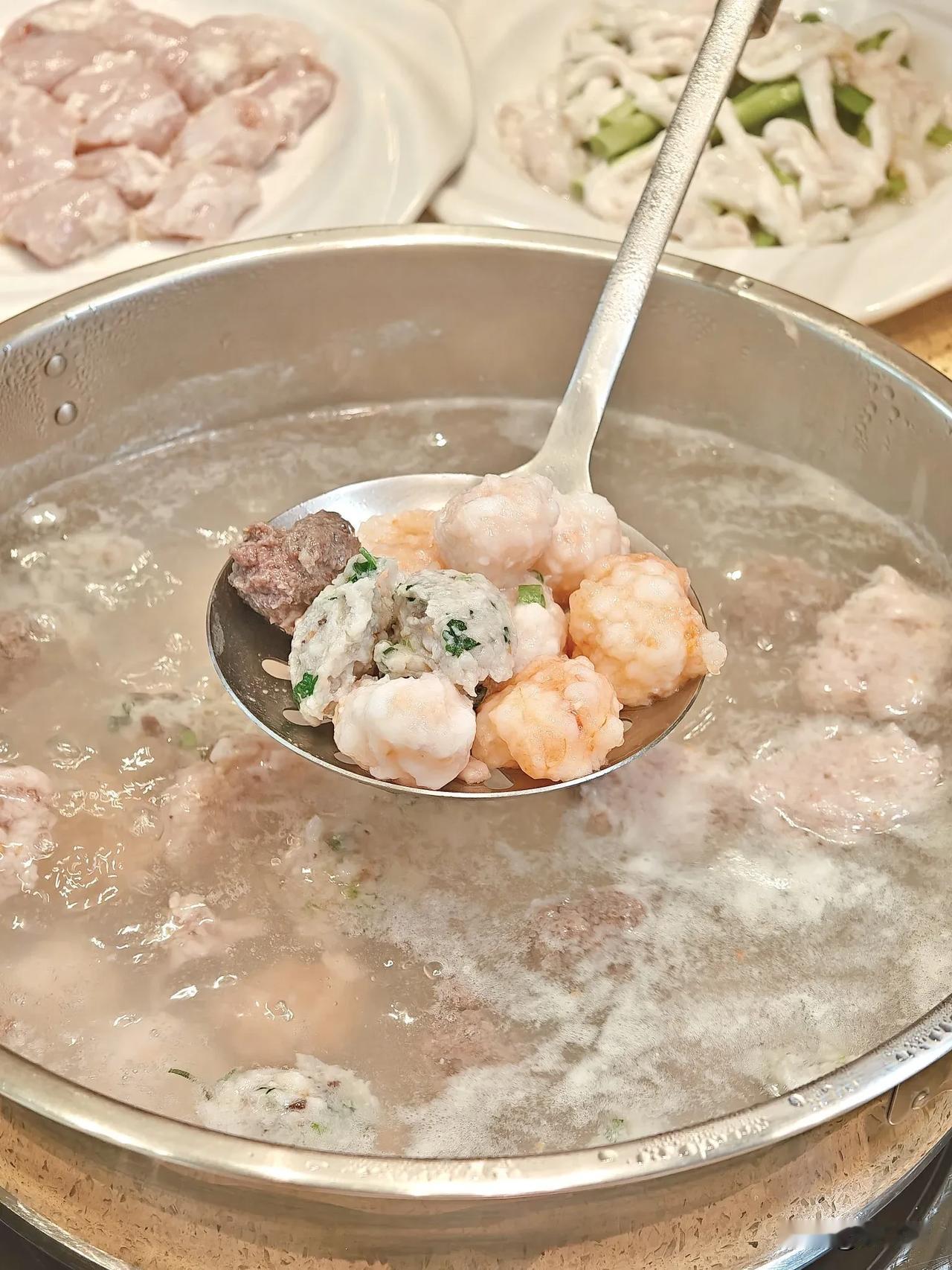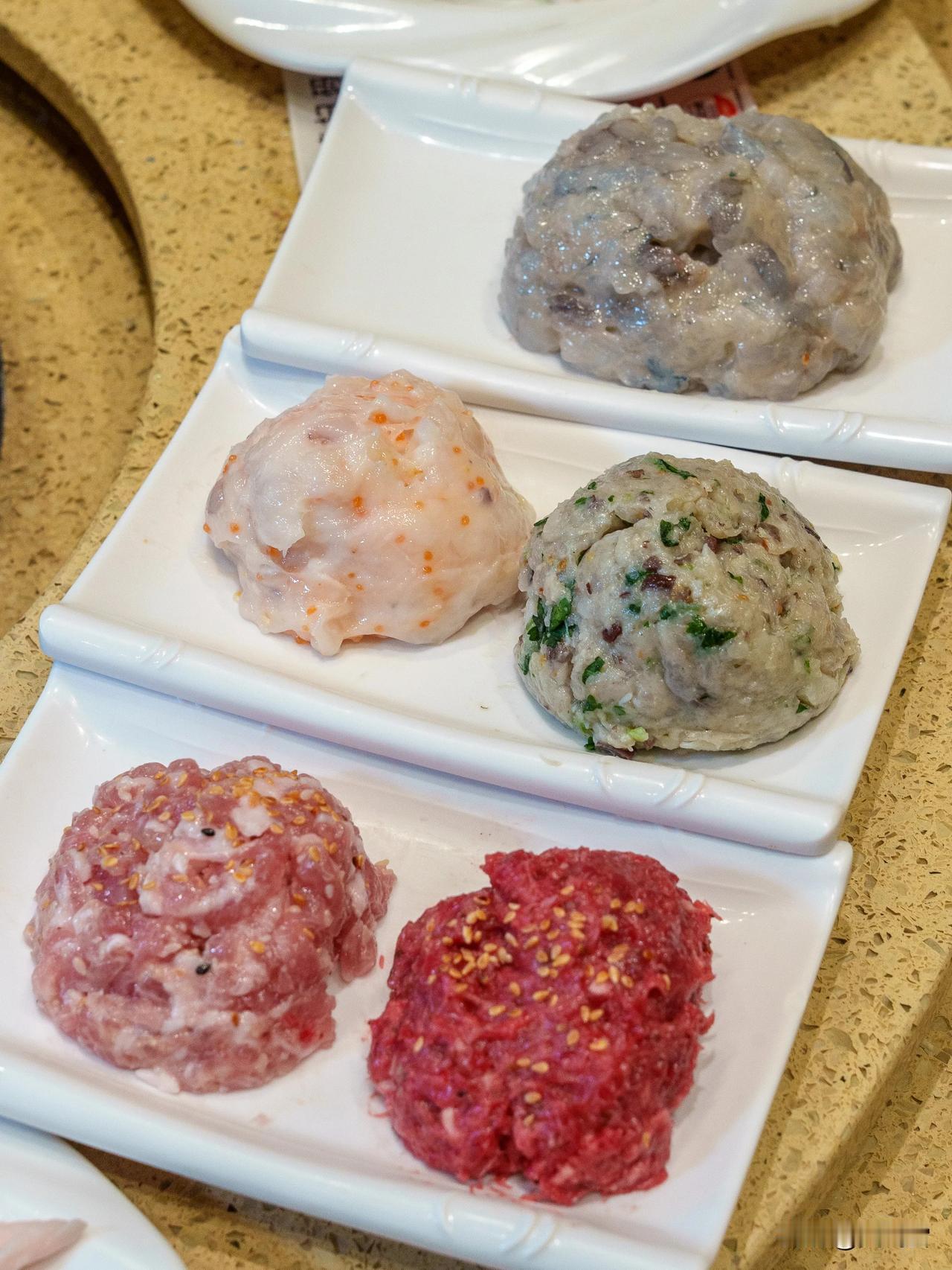 有牛肉、猪肉、鲮鱼、墨鱼和虾几种品种,都是纯手工打制,看得见的鲜肉。如果都想试一下,可以像你们这样拼着下单,煮熟后爽口弹牙,肉味十足,绝不是超市那种淀粉丸可比的