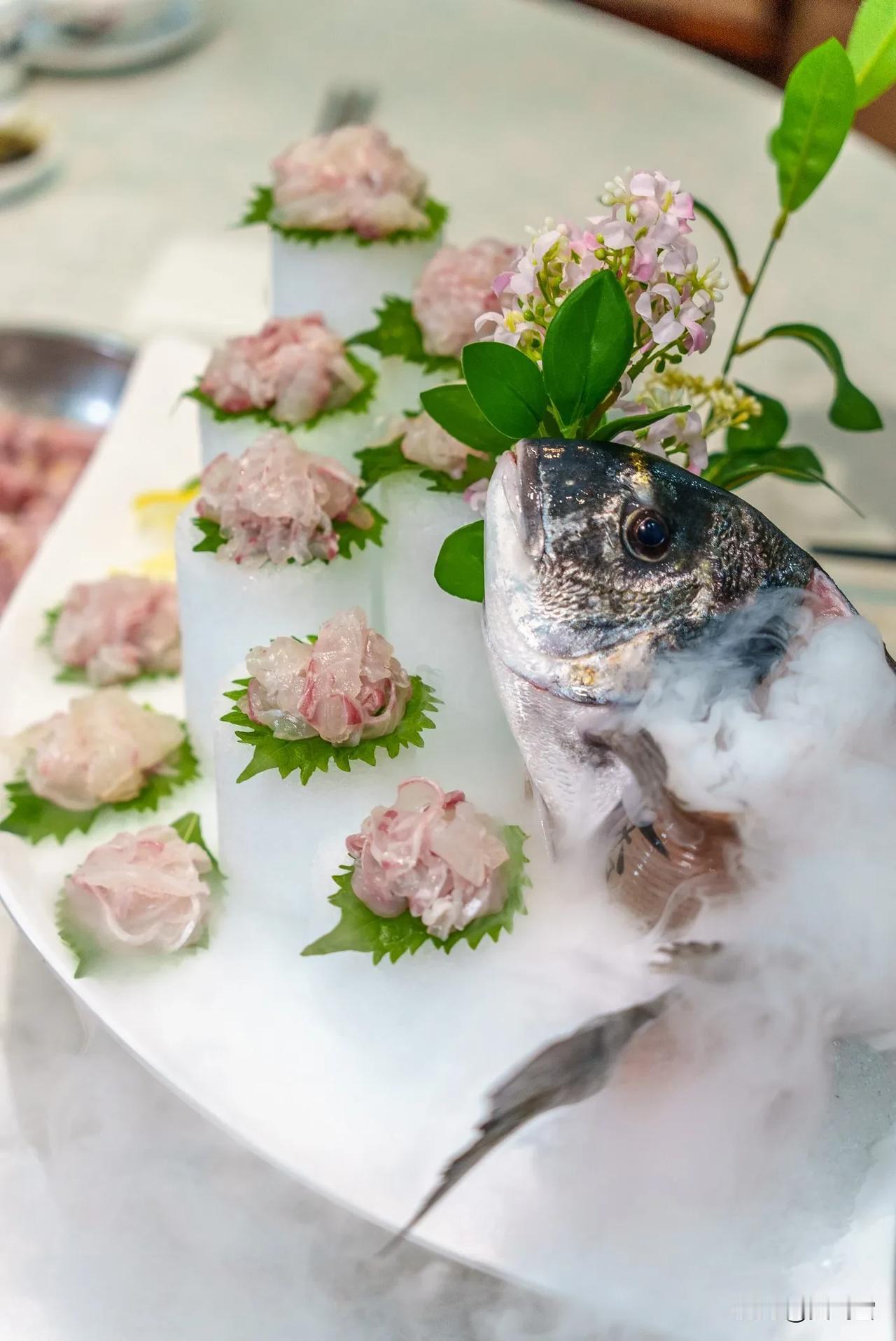 🐠顺德人吃粥爱配鱼生。金鲷刺身片得薄如蝉翼,摆在冰盘上晶莹透亮。拌上姜丝、葱丝、花生、芝麻,淋一点油,捞起后入口,清甜爽滑,与普通鲩鱼截然不同的雅致。