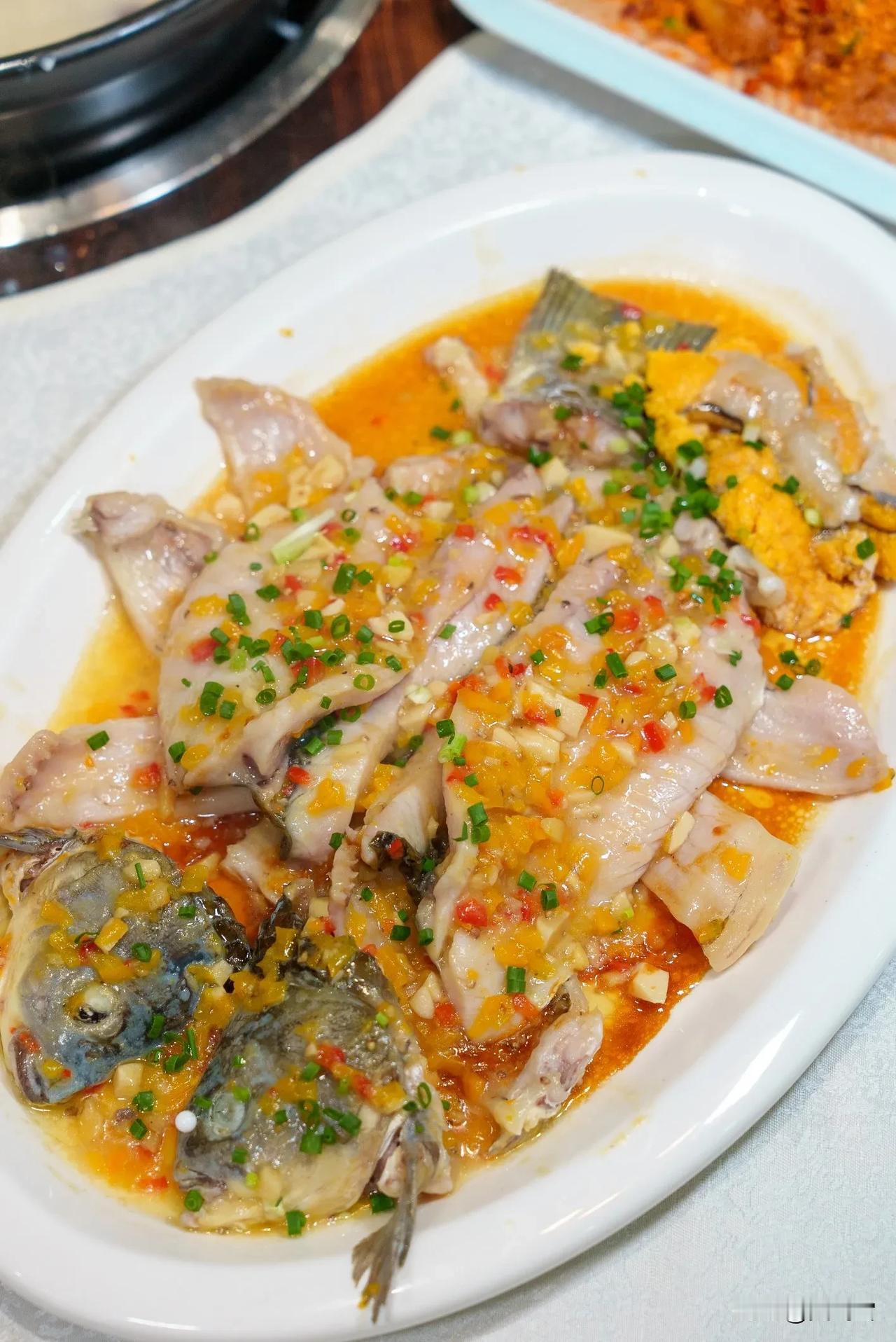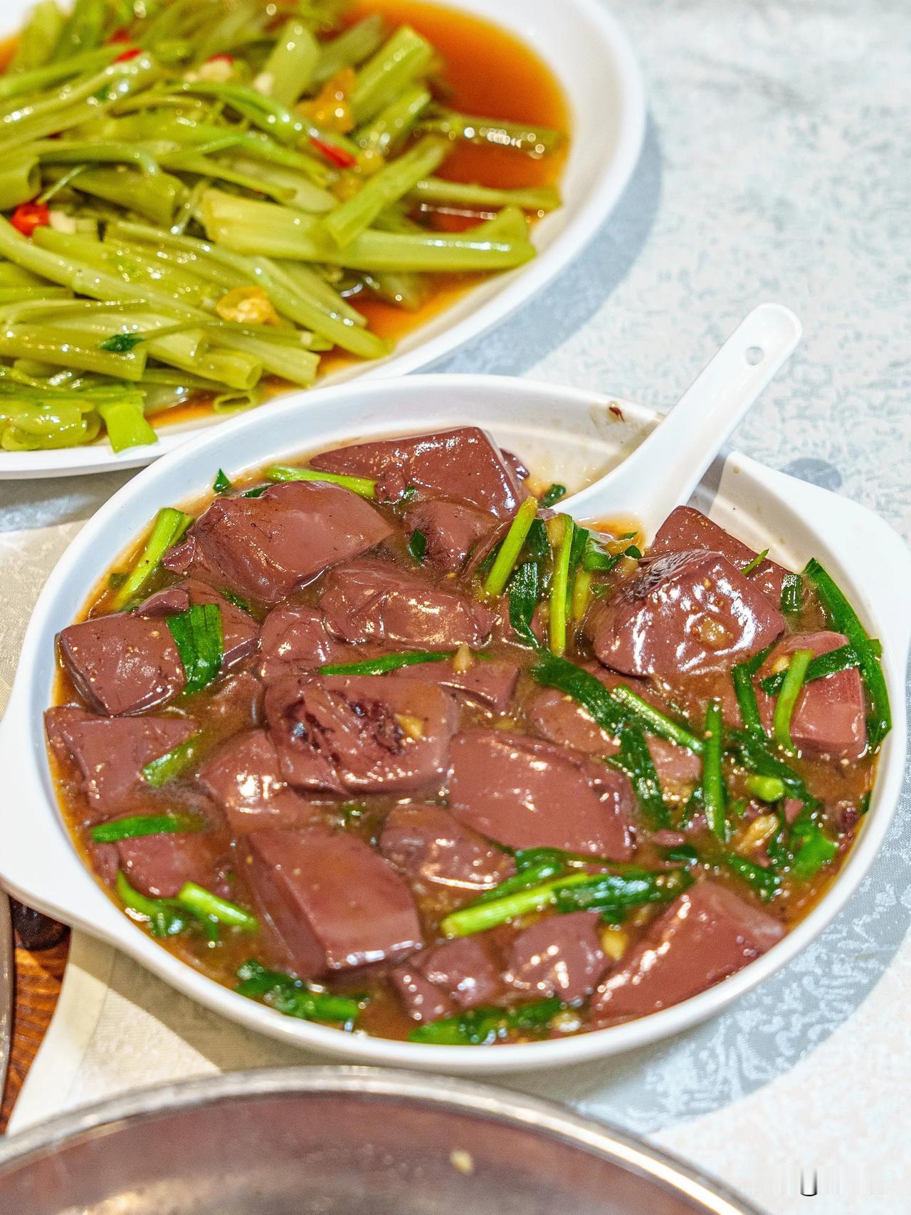 🥗炒菜同样精彩。🥬酸辣通菜梗是开胃神器,酸辣脆爽,让人停不下筷。🍮猪红(猪血)滑嫩如豆腐,热辣暖胃。🍳铁板生肠上桌时还在滋滋作响,生肠脆得像在嚼软骨,酱香浓郁。🐡避风塘九肚鱼外酥内嫩,蒜香扑鼻,鱼肉入口即化。🐟黄椒酱蒸无骨鲫鱼——鲫鱼多刺,这里已细心剔除,配上黄椒酱的咸鲜微辣,鱼肉的鲜甜被完美激发。