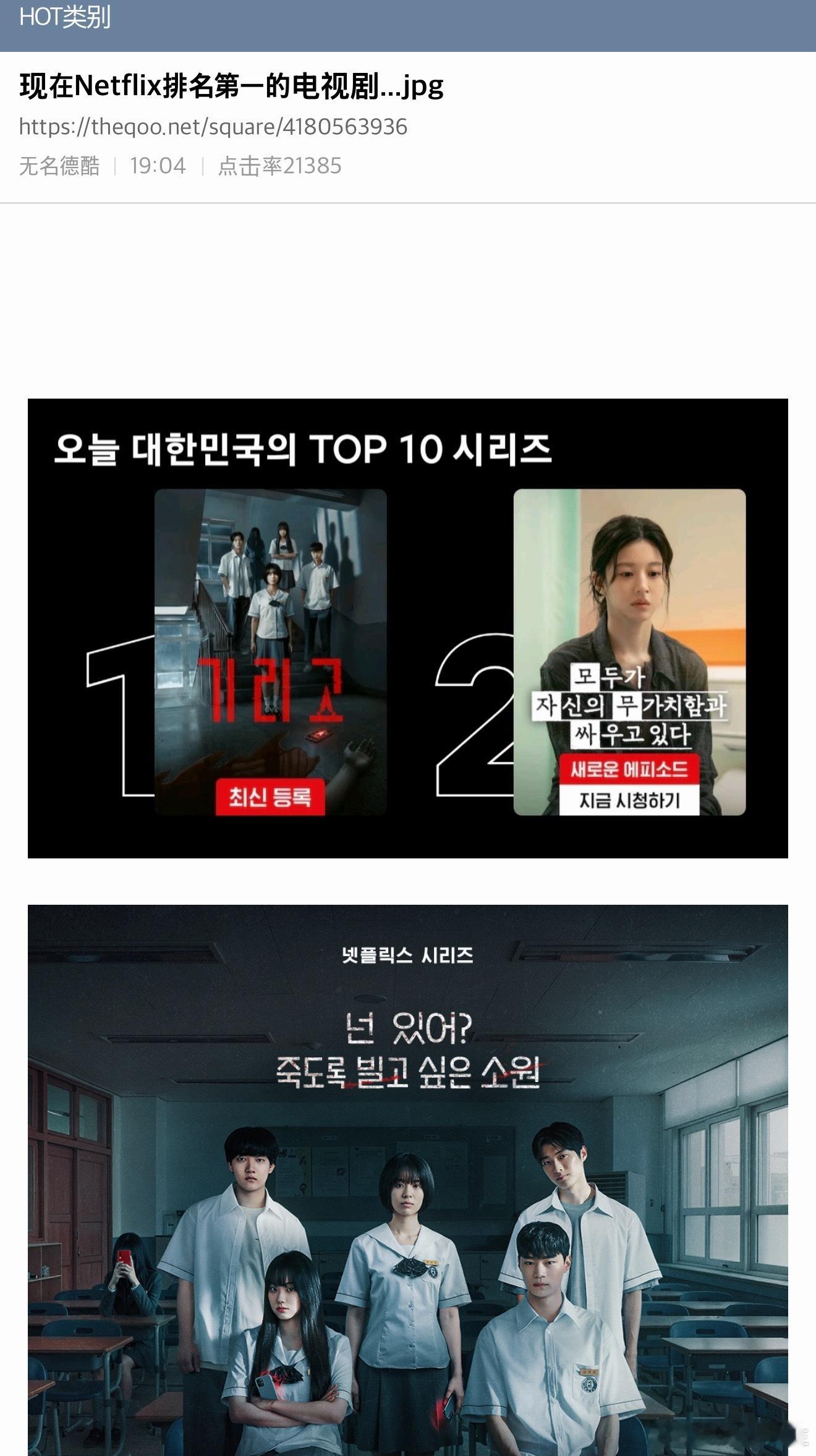 这部剧我还没看呢~但是目前评价还不错【热帖】现在网飞韩国排名第一位的韩剧《夺命许愿》内容 :愿望的代价就是死亡。由于实现愿望的应用程序“Girigo”的诅咒,几名高中生突然死亡。 为了斩断诅咒之链而挣扎的孩子们最终能生存下来吗?
