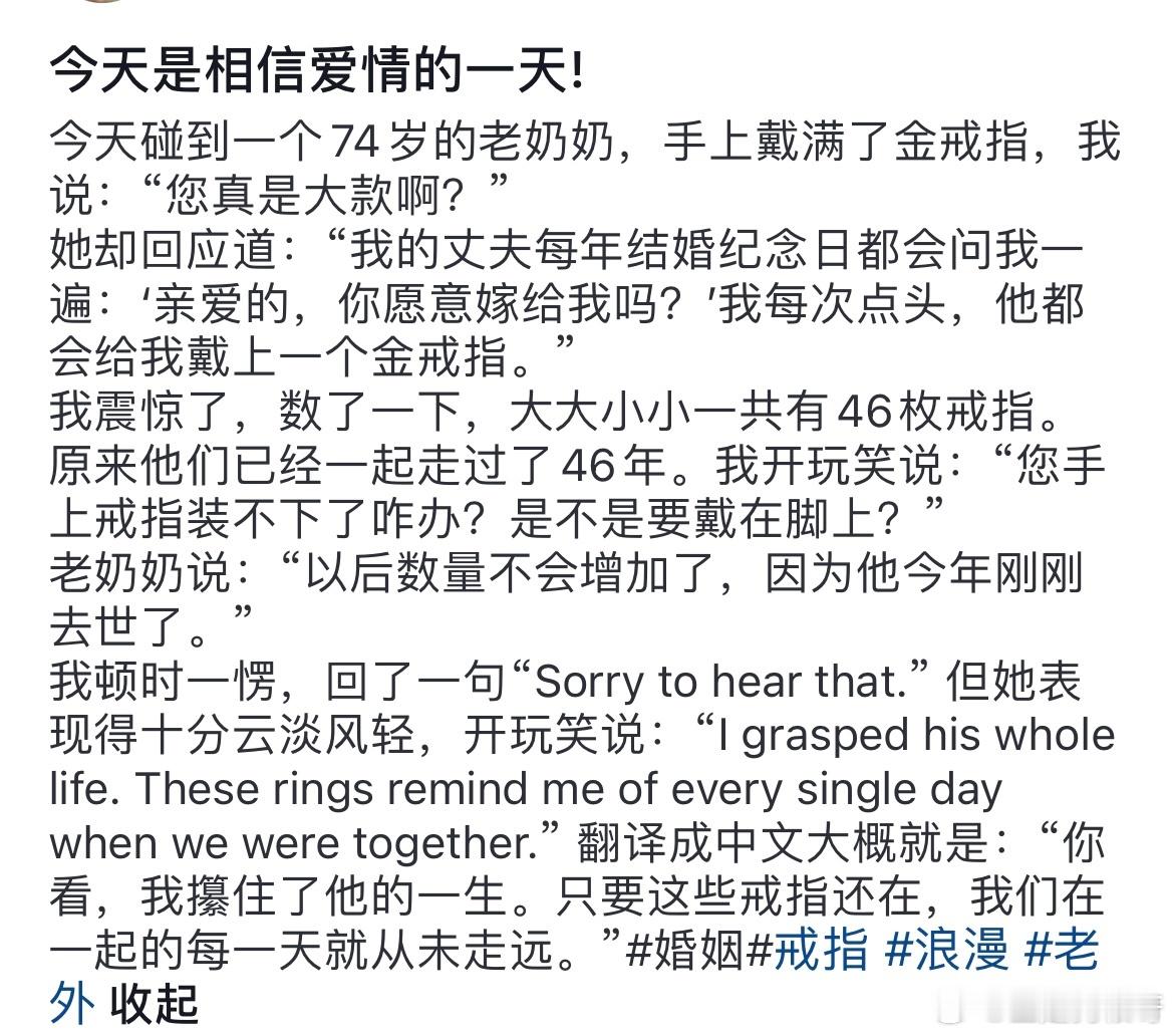 我的丈夫每年结婚纪念日都会问我一遍:亲爱的,你愿意嫁给我吗?我每次点头,他都给我戴上一枚金戒指。