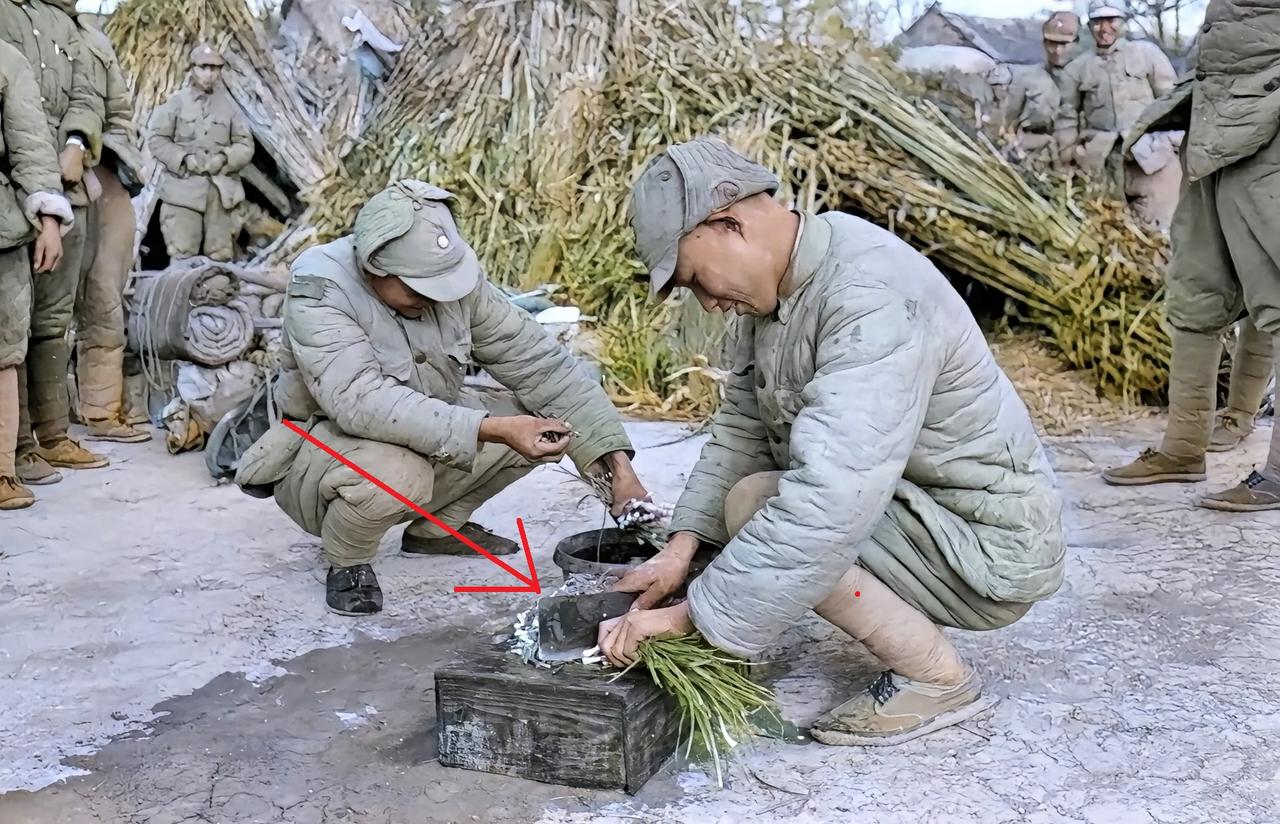 这是摄影师拍摄的一队国民革命军。从这张照片中,我们可以看到他们的伙食情况。此时的他们正在悠闲地做菜,炮弹箱子拿来当菜板,一把野菜切了当配菜。而旁边另一个士兵放锅里放的不知道是野葱还是野菜,其他士兵都围看着。真没想到当时最精锐的美械师吃的还是野菜和野葱。