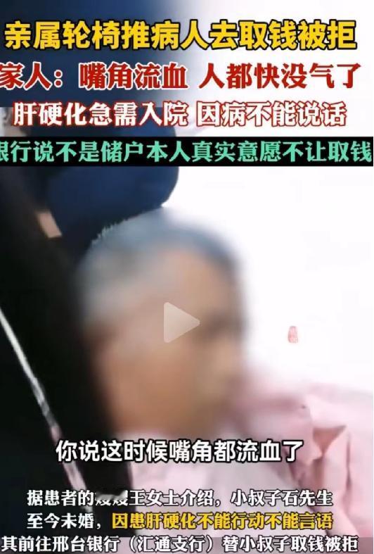 河北邢台,男子因肝硬化急需治疗费用,家属去银行帮他取钱,银行还要求必须本人到场。家属没办法,只能推着轮椅带他到银行取钱,可他因病情不能说话,银行又一口咬定不是男子本人的意愿,拒绝给男子取钱。男子亲属:你看他嘴角都流血了,都快断气了,这钱急需救命,何苦这么为难人呢?