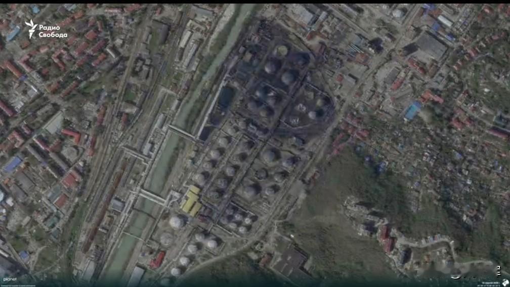 下图是4月15日与4月26日乌克兰多次打击前后,图阿普谢炼油厂的卫星对比影像。