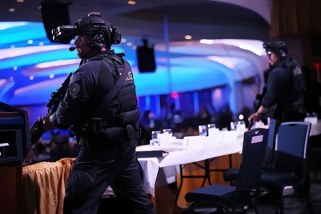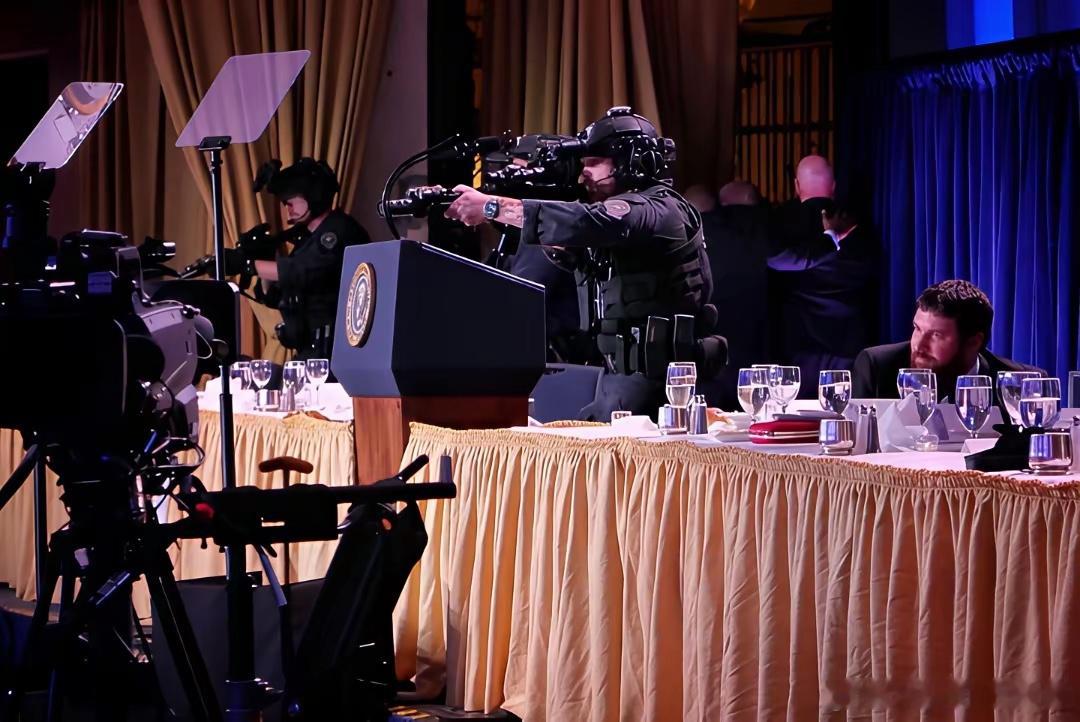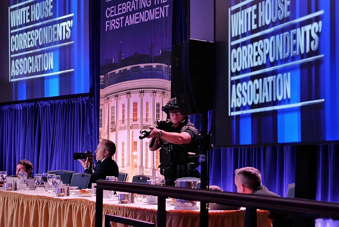 美国白宫记者协会晚宴遭枪手袭击,最震撼的一幕,枪手拿着霰弹枪冲进大厅的时候,周围