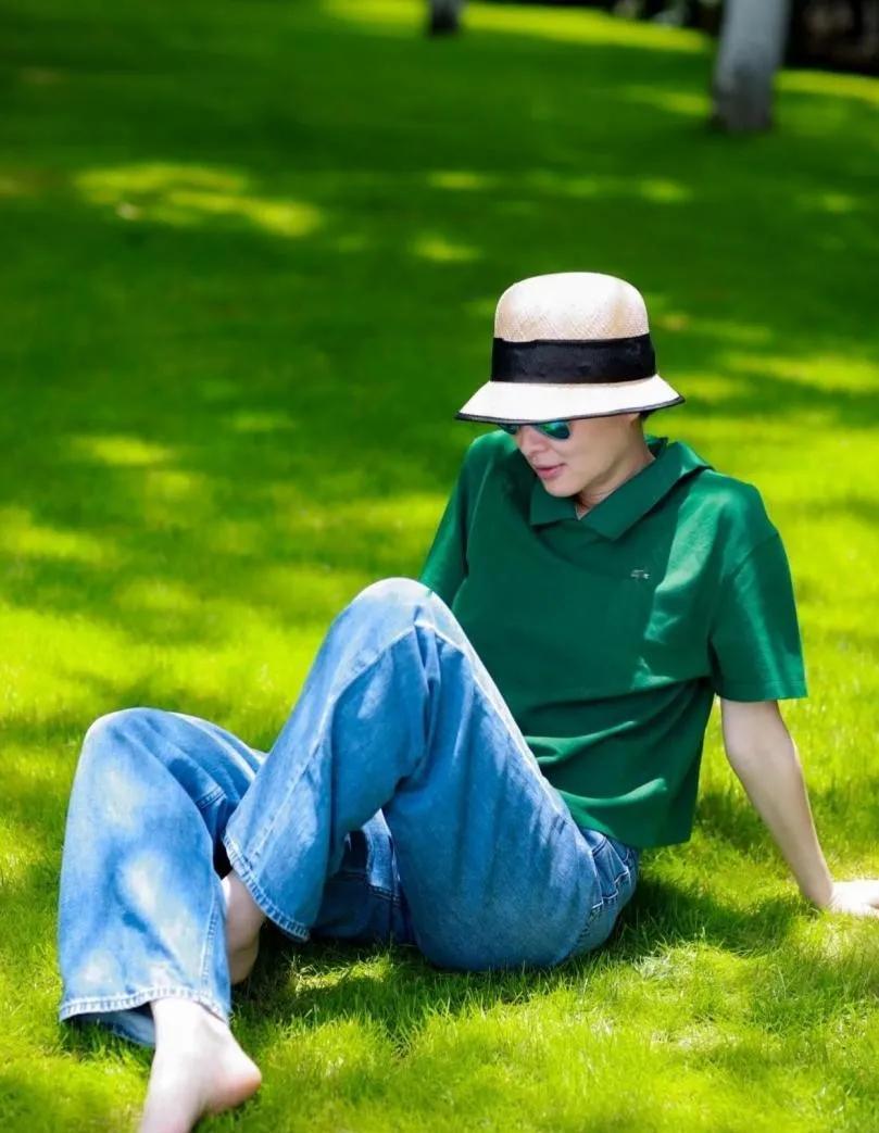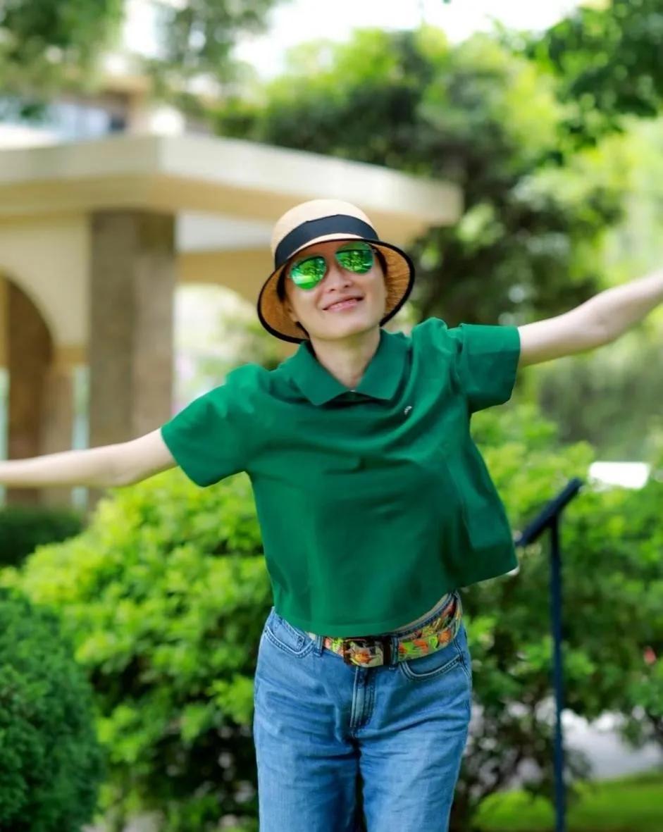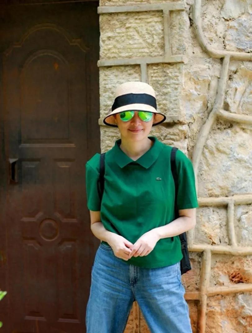 53岁吴越的中年穿搭真的完全没有大妈味!森林绿polo衫+蓝色牛仔裤,简约又时髦✅