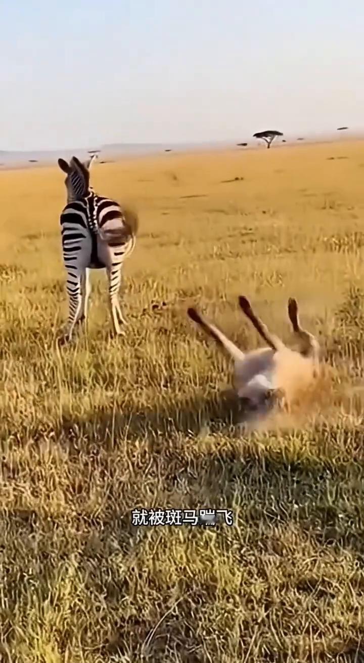 ·太奶猎狗刚想对斑马施展掏肛绝技,就被斑马踹飞。另一只猎狗更是直接被斑马踢到空中,当场吐血身亡,把猎狗同伴都吓坏了。