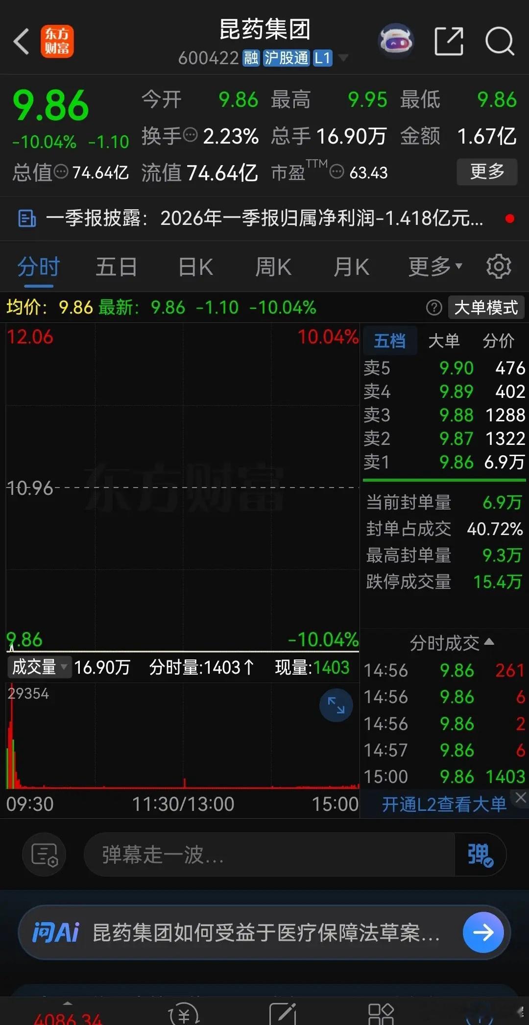 结果周末公司公布了一季报,归母净利润亏损1.418亿元,同比下降256.7%,扣非净利润亏损1.902亿元,同比下降363.98%,而且公司出现了近20年来的首次亏损,说明业绩确实恶化了!今天开盘一字跌停,直到收盘跌停板上仍有近7万手封单。