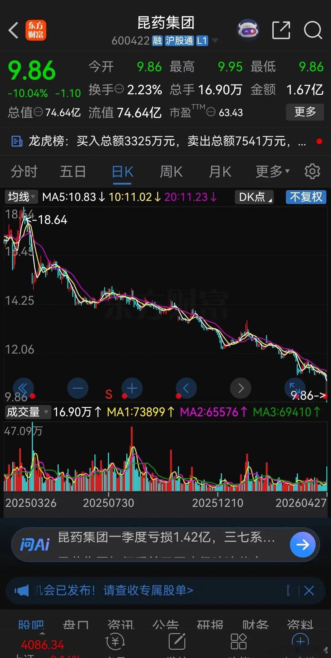 没有无缘无故的下跌!昆药集团从去年四月份就开始一路单边下跌,整整下跌了一年,上周