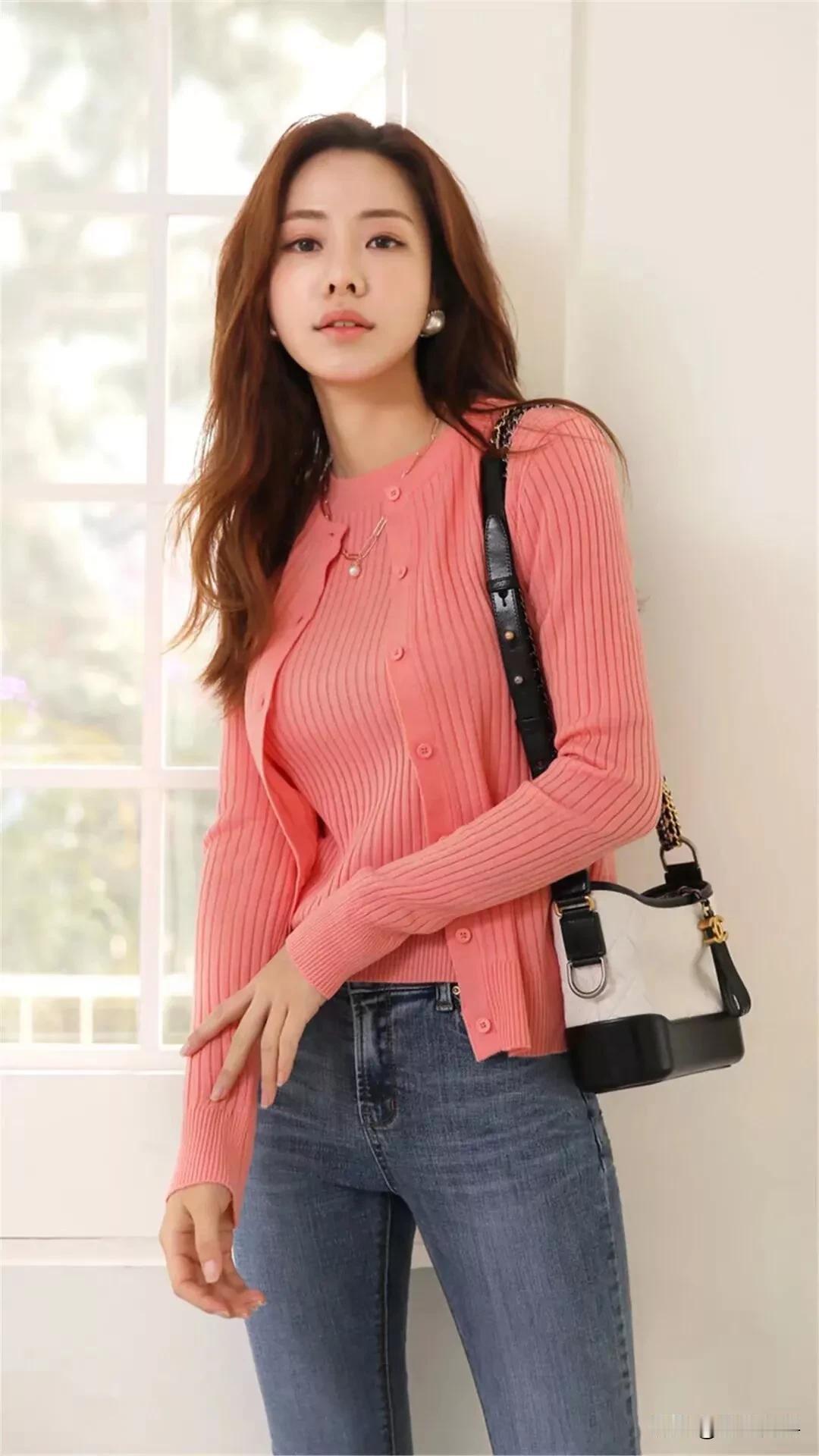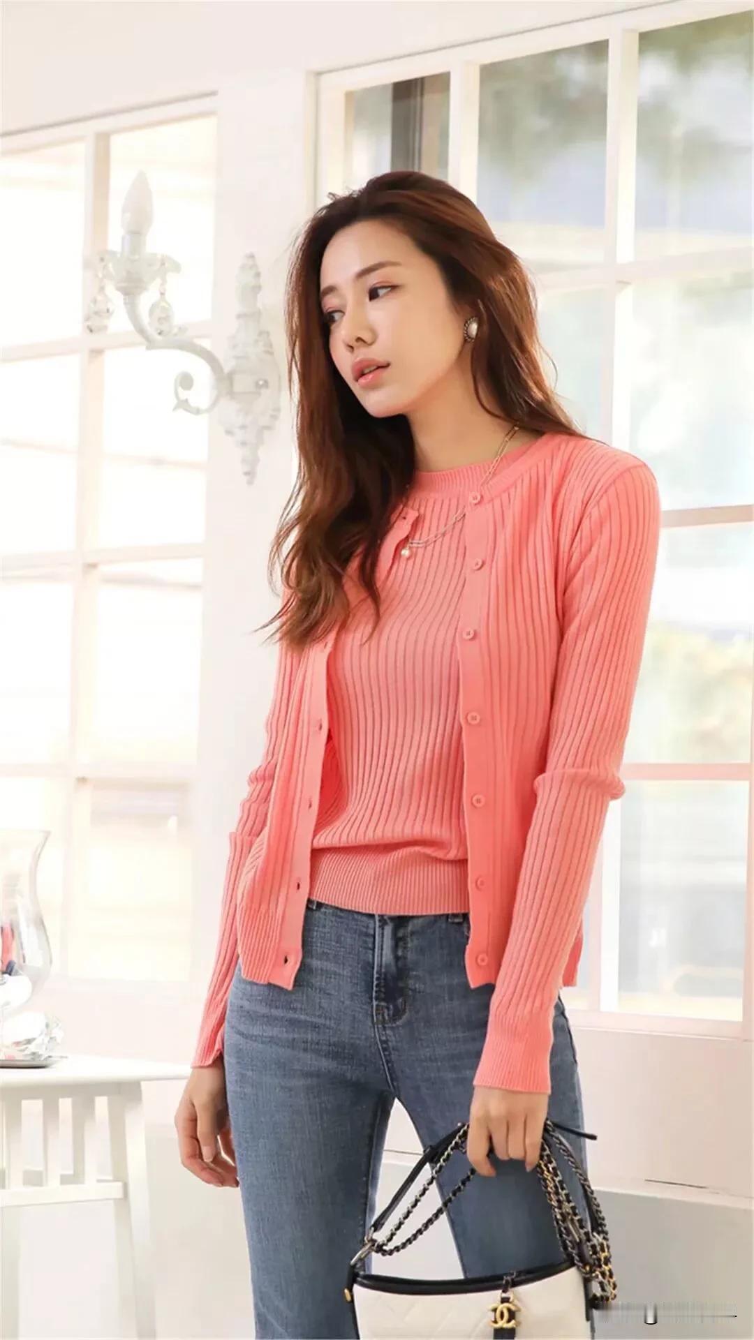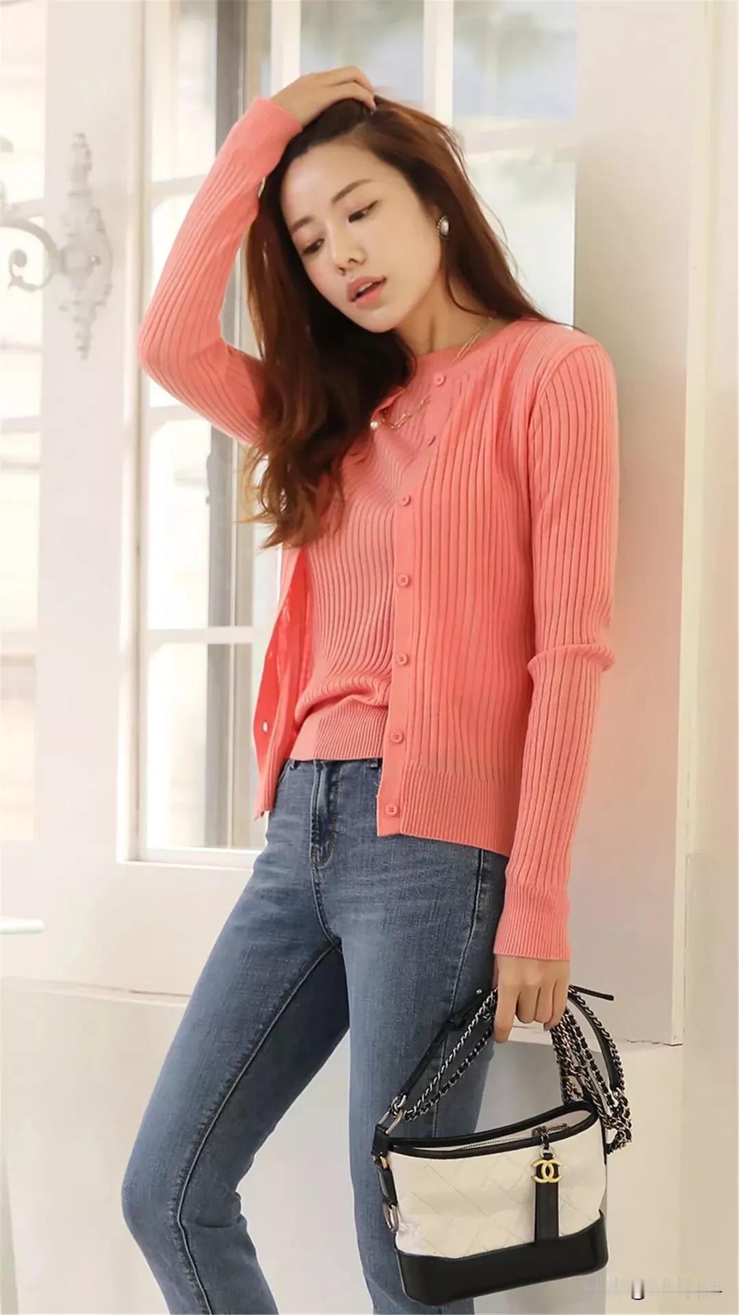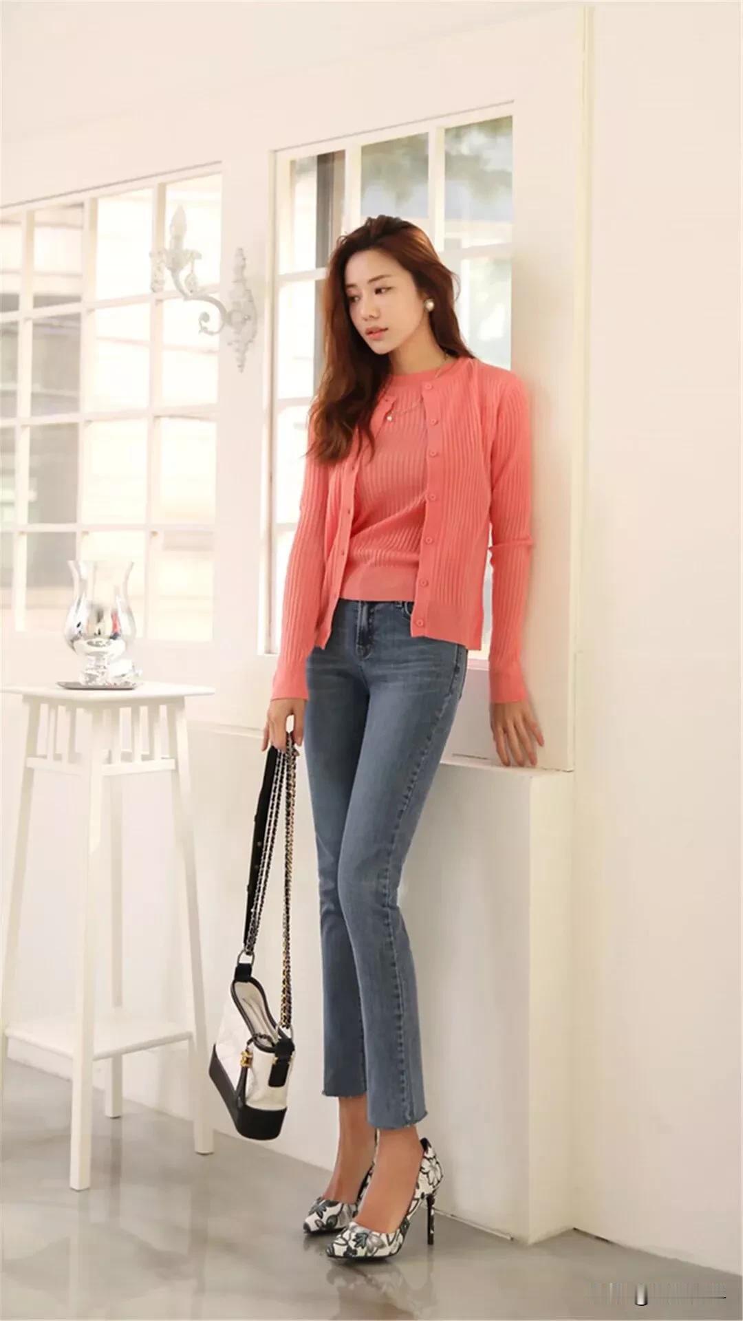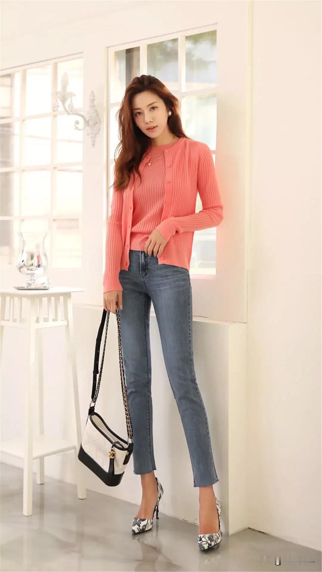 温柔粉橘色毛衣搭配牛仔裤,简直是时尚界的经典组合。直筒牛仔裤就很适合,它能修饰腿型,让腿看起来又直又长,搭配粉橘色毛衣,时尚甜美感一下就出来了。