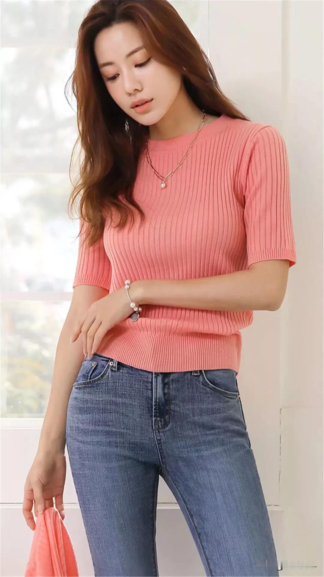 温柔粉橘色毛衣搭配牛仔裤,简直是时尚界的经典组合。直筒牛仔裤就很适合,它能修饰腿