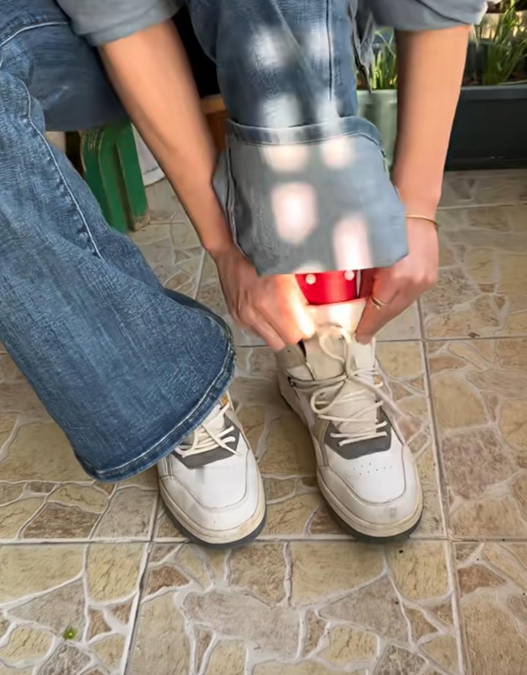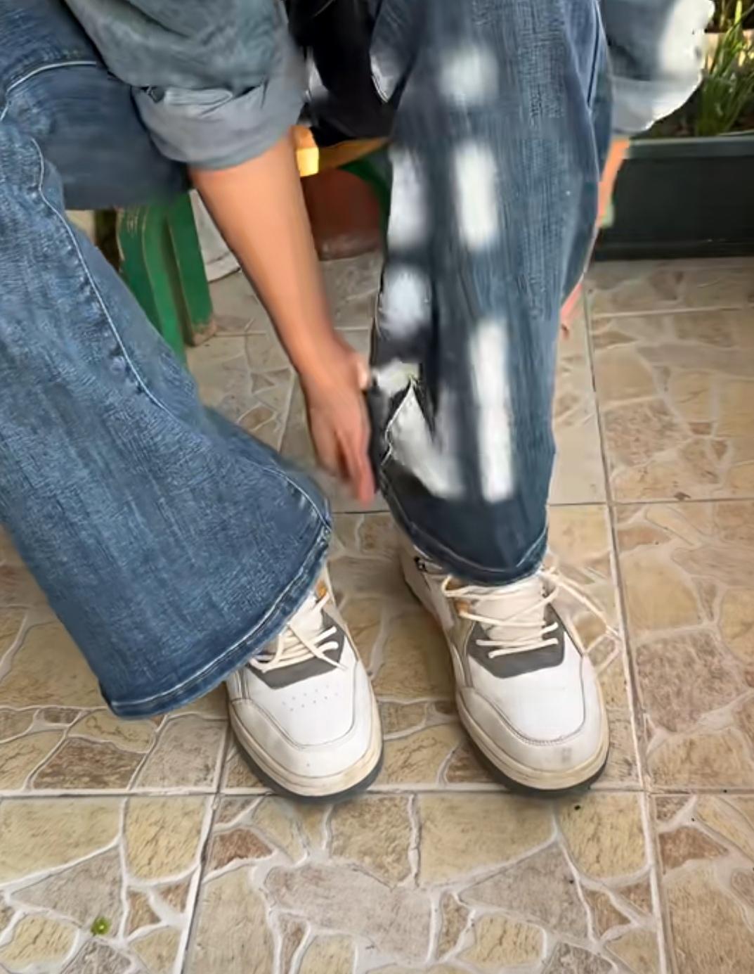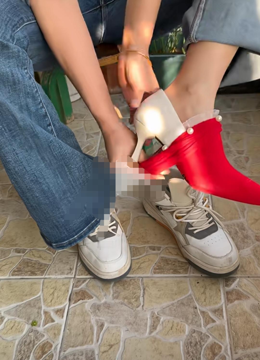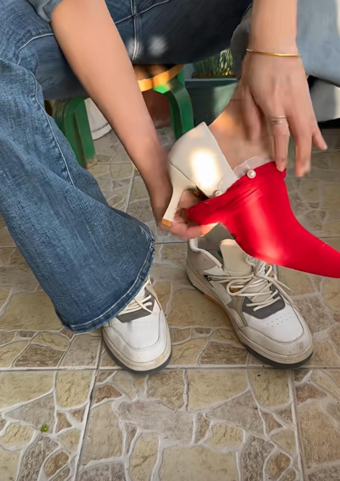 这一位博主,真是高人在民间,他想出了,把一双高跟鞋套上鞋套,再把它穿进旅游鞋中,长长的牛仔裤下拉盖上。瞬间身高增加了3—4厘米。