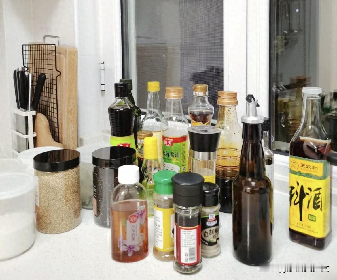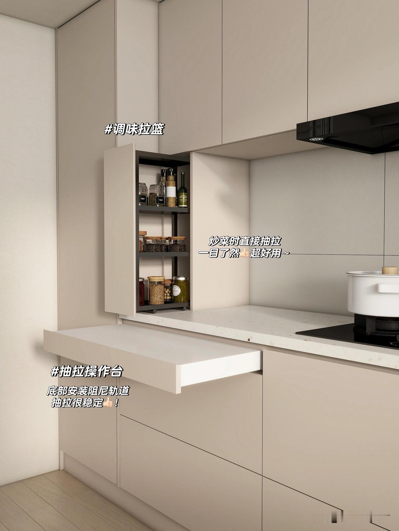 地柜靠操作区那侧,我做了20厘米深的薄柜,台面上方也延伸到吊柜。调料瓶、保鲜膜、案板全竖着塞进去,台面干干净净。常规做法是全部60厘米深,很多东西塞里面够不着,这个薄柜被邻居夸“抄作业”。