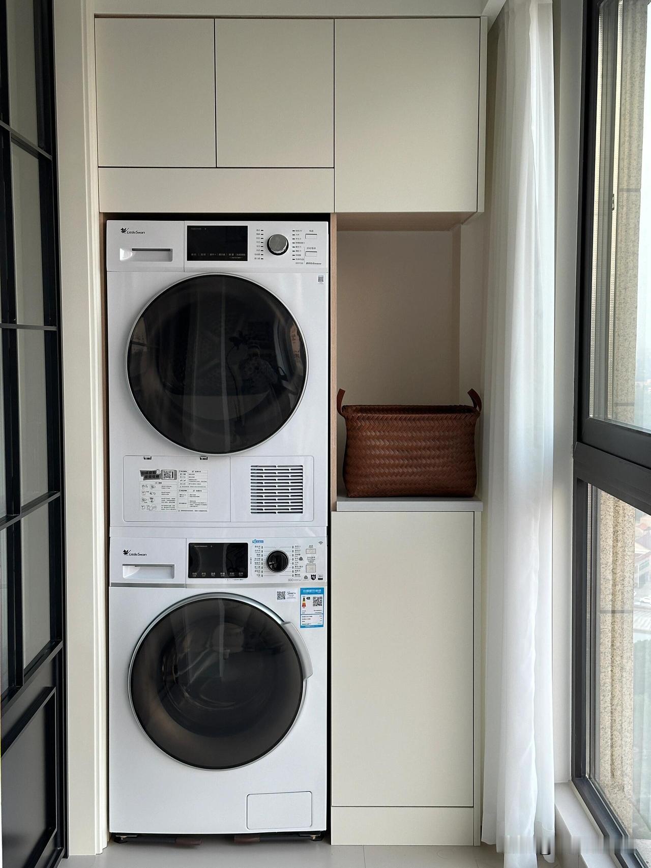 扫把、拖把、吸尘器、挂烫机,统统竖着塞进去,柜门一关,外面干干净净。没有底板,灰尘直接落在地面,吸尘器一吸就好。