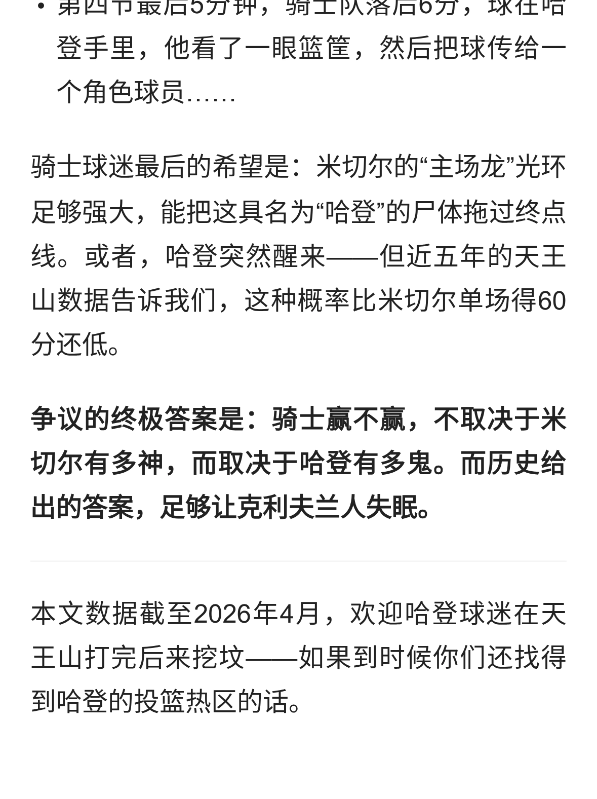 别再骗自己了。骑士队交易来的根本不是哈登,而是一个被焊死在季后赛的...
