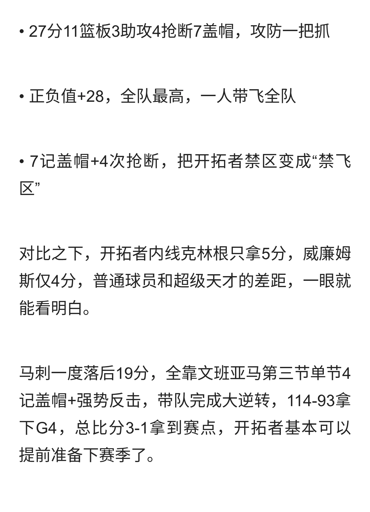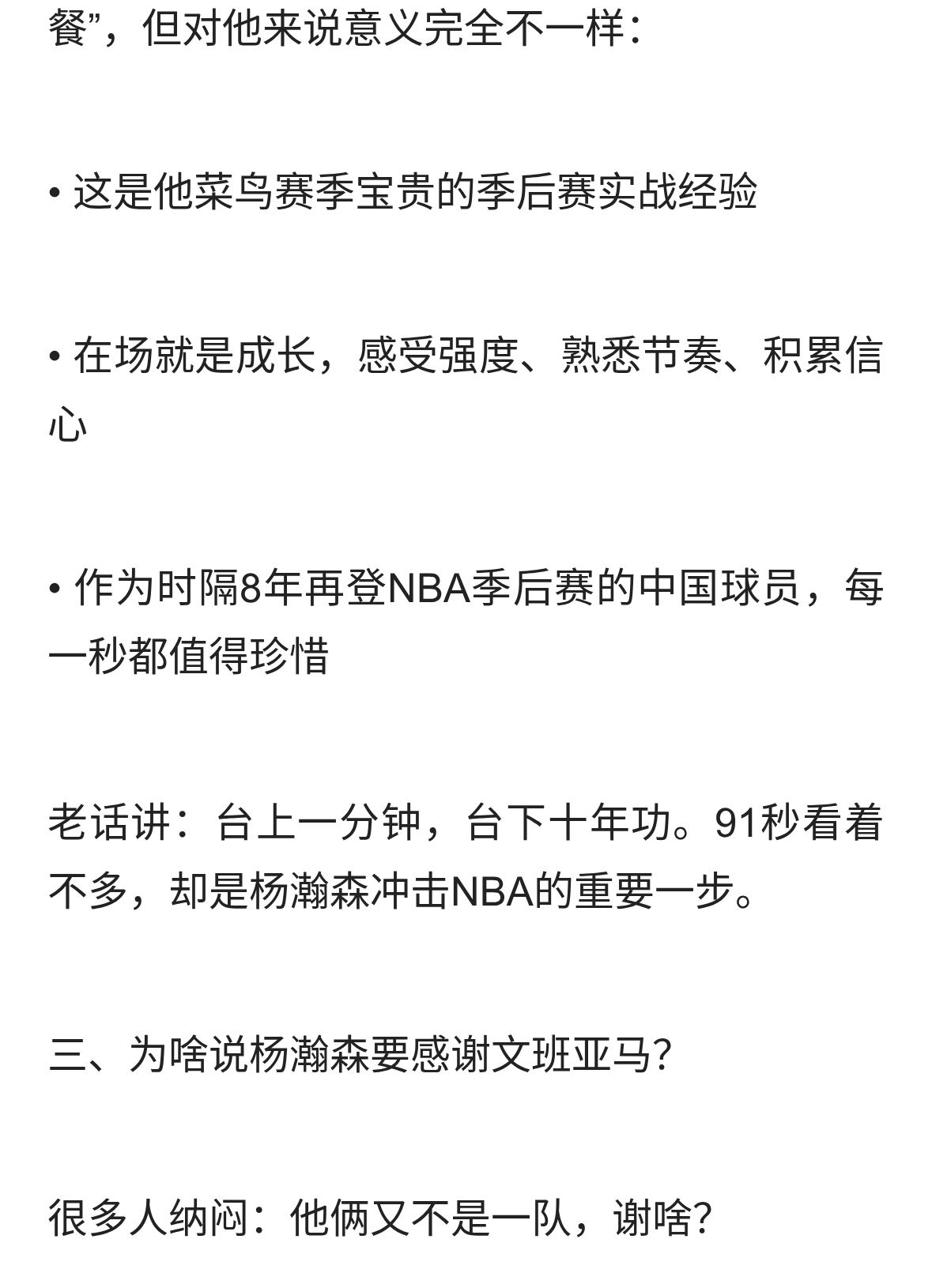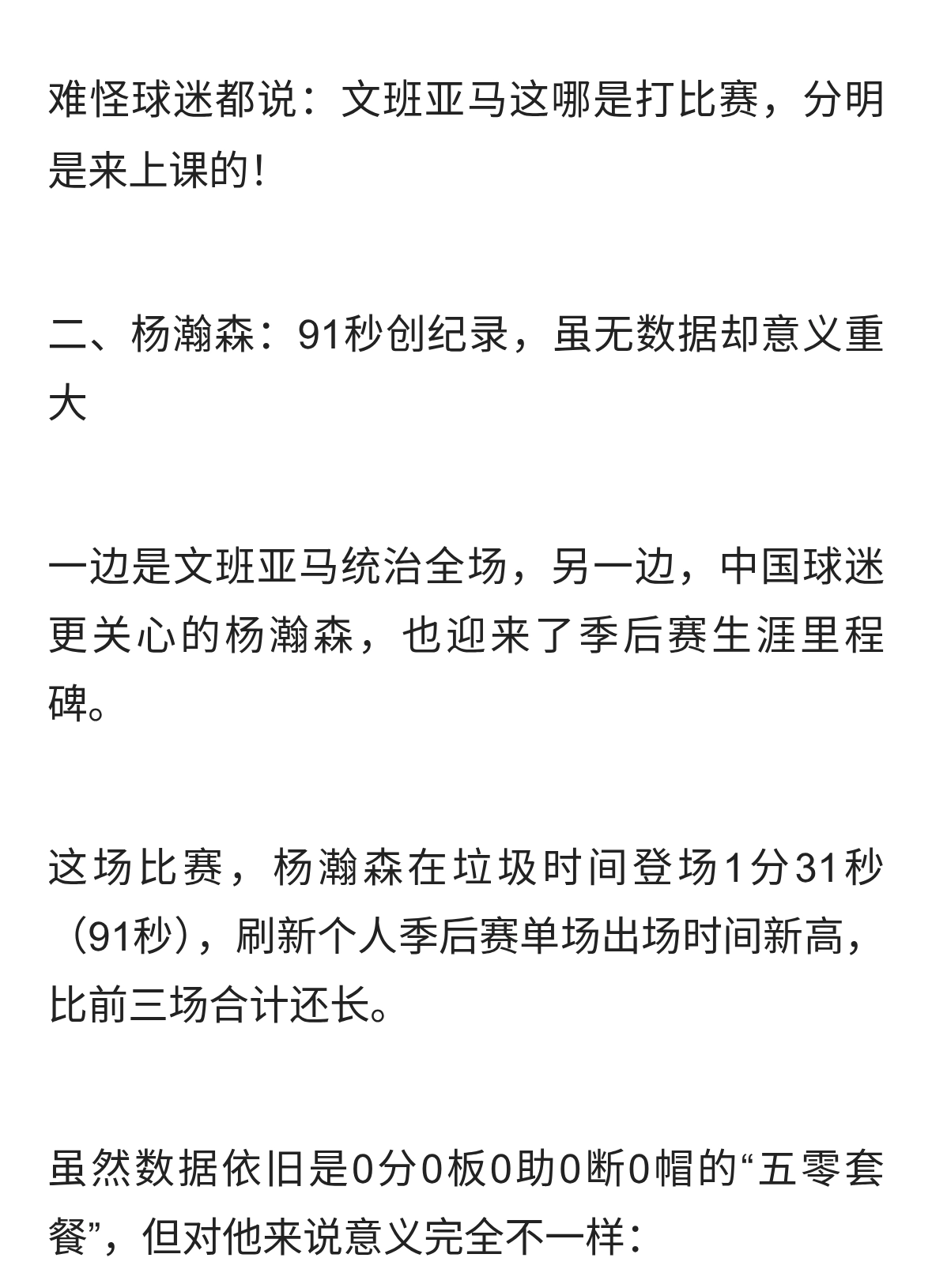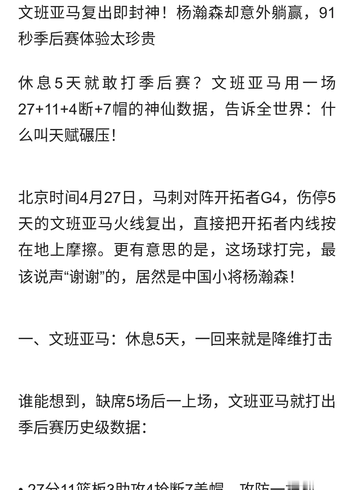文班亚马复出即封神!杨瀚森却意外躺赢,91秒季后赛体验太珍贵