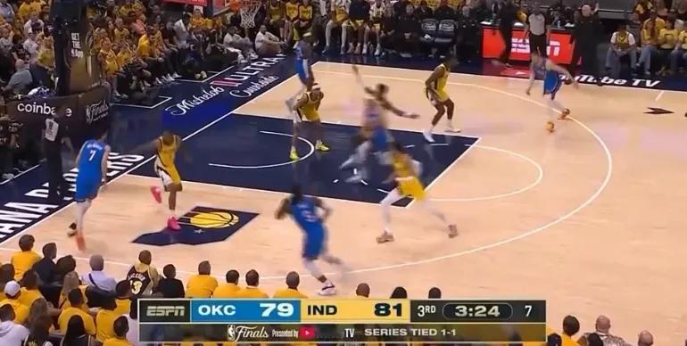 第三节比赛,两队展开了对攻大战。双方球员都接连打成漂亮进攻,比分迅速上涨。特纳抛投命中后,步行者队72-70反超雷霆,随后步行者队完成抢断,哈利伯顿反击扣篮,点燃了全场的气氛。不过雷霆队也不甘示弱,亚历山大撤步三分投进,帮助球队咬住比分。