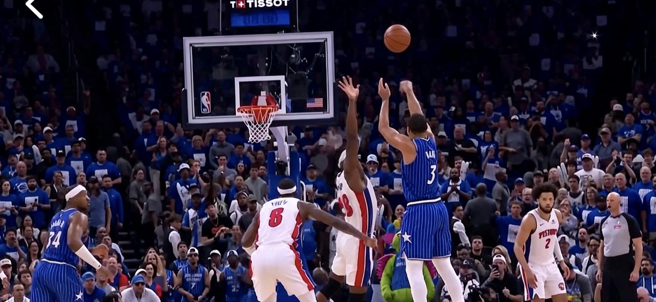 G4最后1分25秒,贝恩弧顶持球后面对防守一记不讲理3分打板命中,帮助魔术领先达到了6分,这一球,几乎给活塞判了死刑!