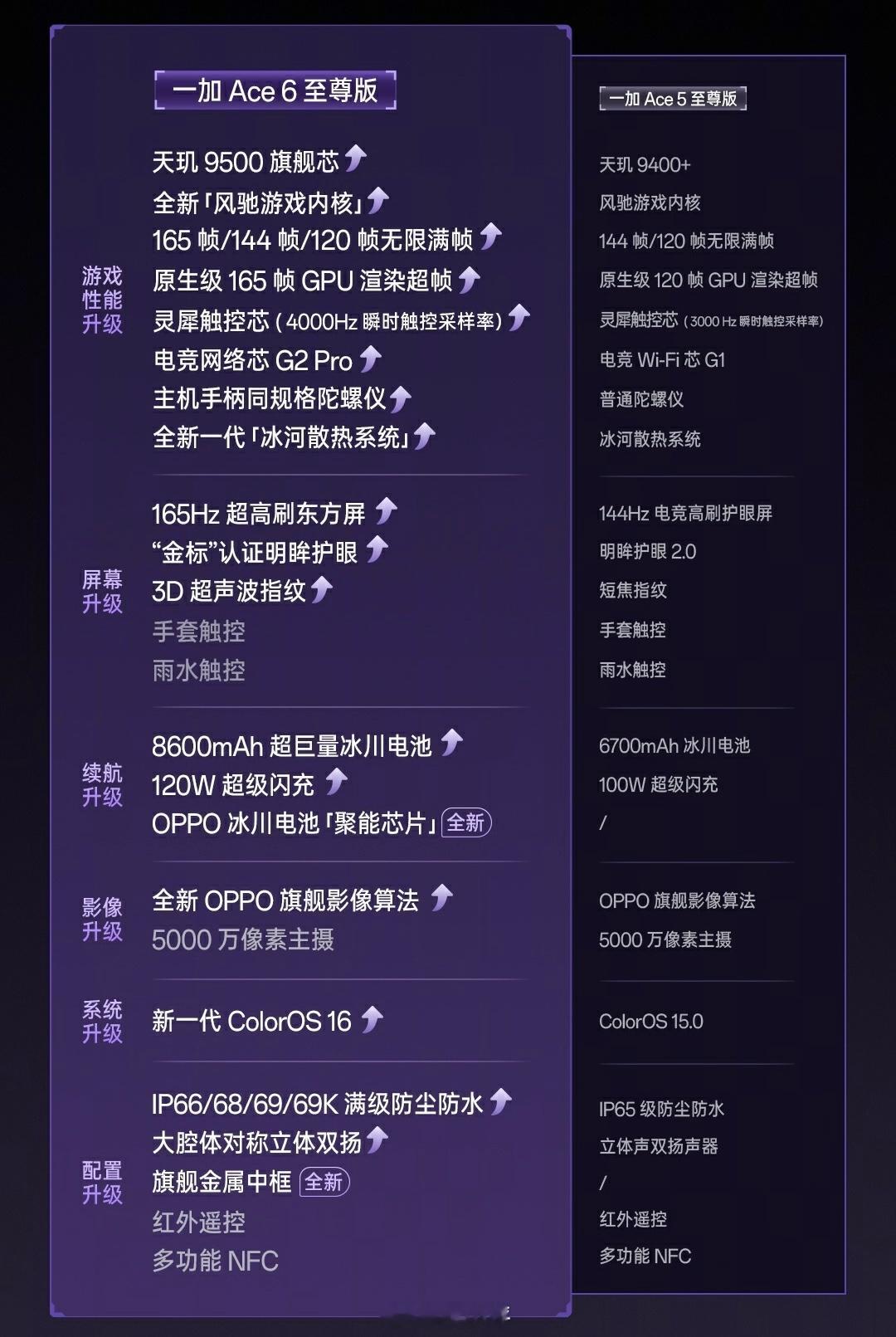 一加Ace6至尊版今晚发布,大家估个价吧官方对比图有点意思,在上一代基础上加上