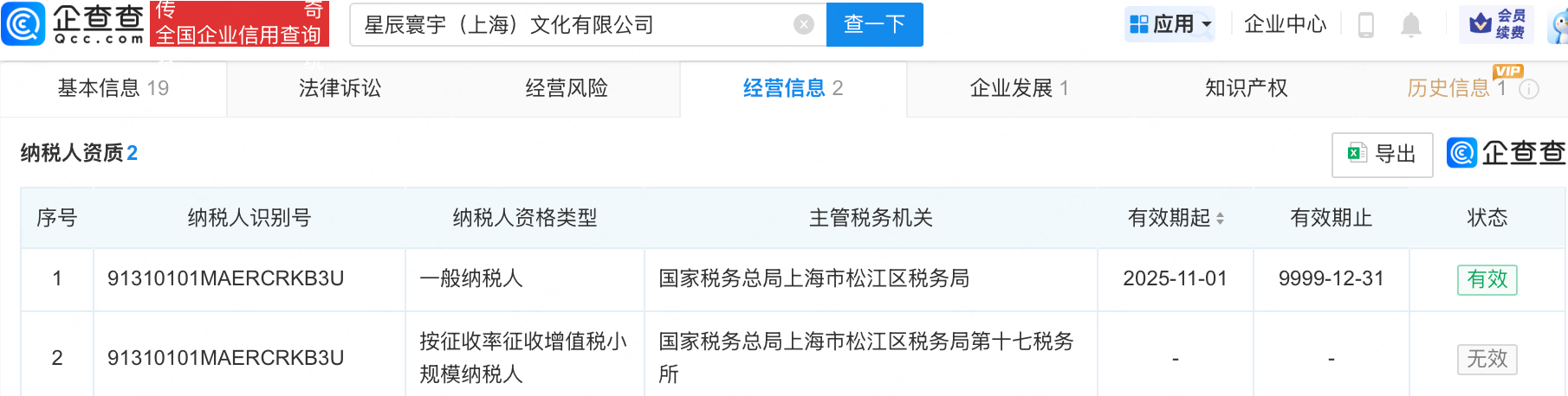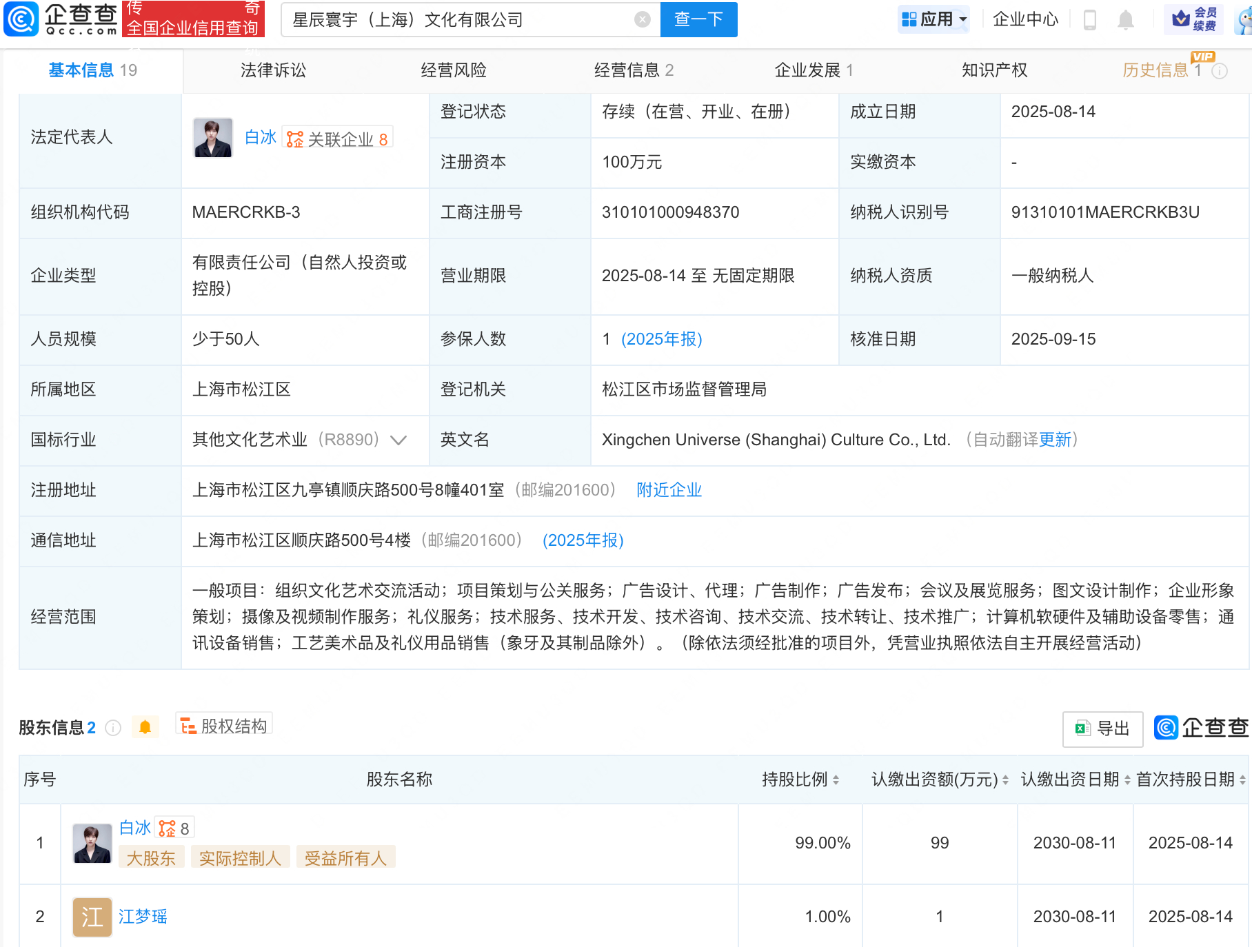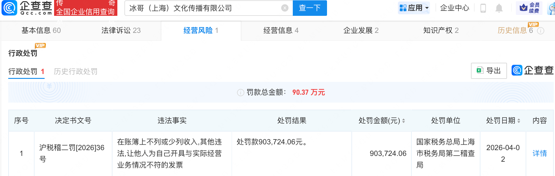 企查查APP显示,白冰共关联8家企业,目前存续5家,其中星辰寰宇(上海)文化有限公司为其MCN公司,该公司成立于2025年8月,由白冰持股99%,信息显示,该公司为一般纳税人。此外,由白冰持股70%的冰哥(上海)文化传播有限公司今年4月2日被国家税务总局上海市税务局第二稽查局罚款90.37万元,违法事实为其在账簿上不列或少列收入,其他违法,让他人为自己开具与实际经营业务情况不符的发票。白冰回应偷税被查