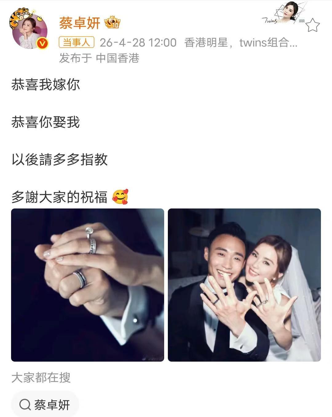刚刚看到蔡卓妍结婚的消息,脑子有点懵,从隐婚到姐弟恋,阿SA的最终归宿来了吗?