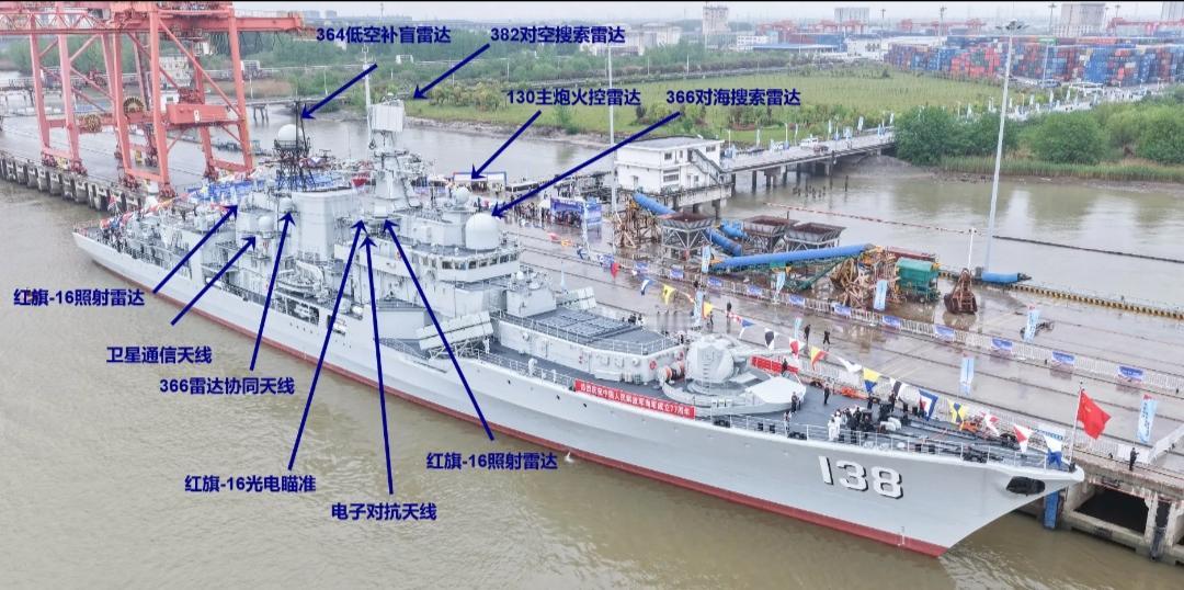 这是改装之后的138泰州舰,作为我国引进的俄制956EM型现代级驱逐舰,满载排水量约8400吨。于今年4月完成全面现代化改装后,在人民海军成立77周年之际向公众开放,泰州舰是目前4艘现役现代级中改装幅度最大,战力跃升最强的一艘。