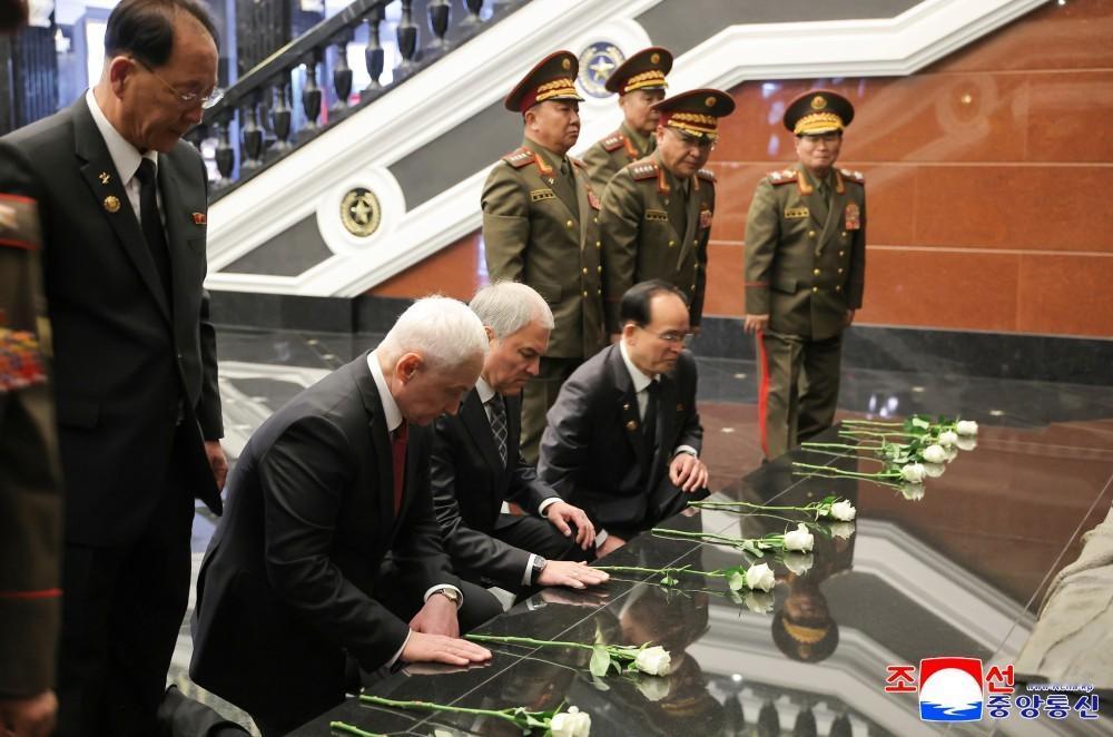 据朝中社报道,朝鲜的“海外军事行动战斗功绩纪念馆”正式落成并举行了隆重的竣工典礼,金正恩率朝鲜党政军高层参加典礼,俄罗斯国家杜马主席沃洛金和防长别洛乌索夫也亲自飞抵平壤,参加竣工仪式。