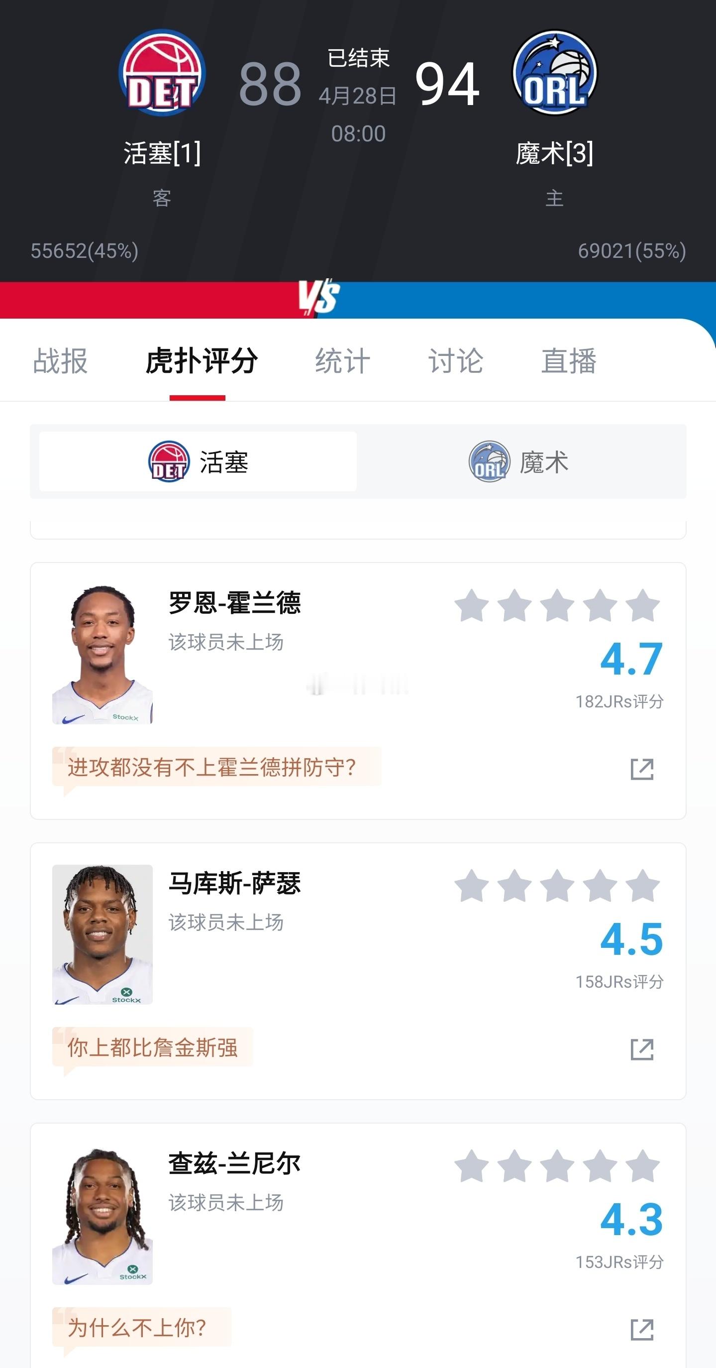 奥兰多魔术贝恩22分5板1助,弗兰茨-瓦格纳19分5板3助,班凯罗18中4得18分8板4助,萨格斯13中1得5分2板2助;底特律活塞坎宁安25分9板6助,托拜厄斯-哈里斯20分6板,杜伦12分8板3助。魔术vs活塞nba季后赛