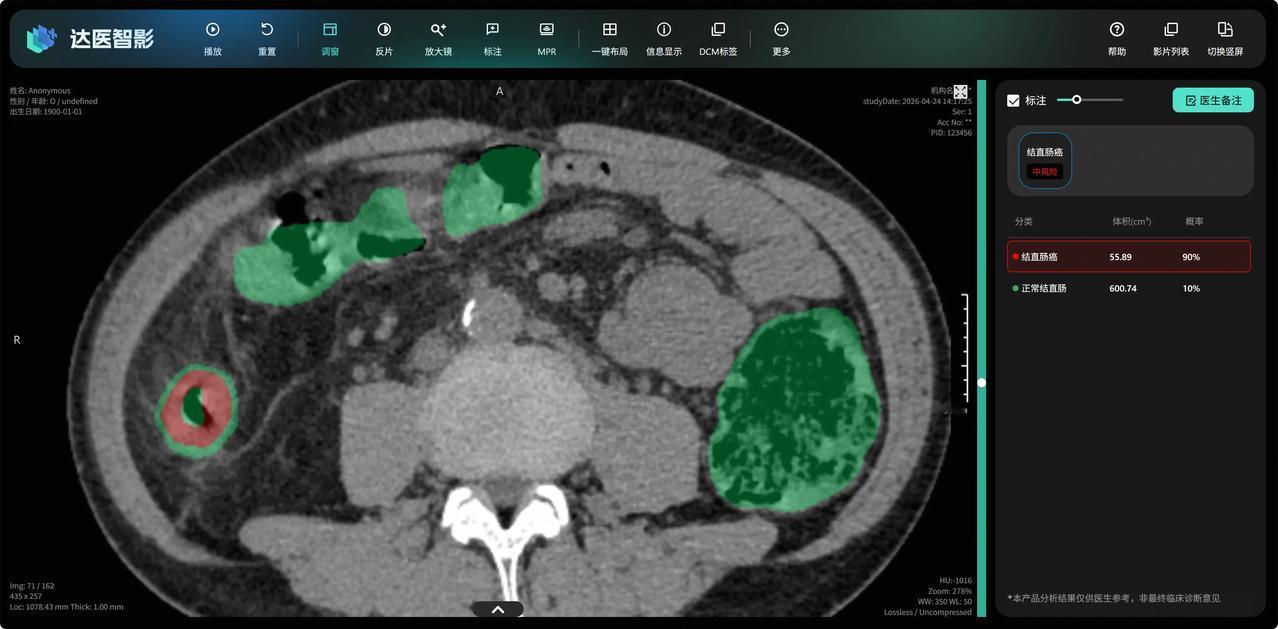 像是为了印证这一观点,仅仅三个月后,阿里达摩院再次在癌症筛查上迎来突破。联合广东省人民医院等机构研发出了肠癌筛查AI模型DAMO COCA,再次登上影响因子高达65.4的顶刊《肿瘤学年鉴》,论文显示,这项技术成功在2.7万人的平扫CT中发现了5例肠癌漏诊病例,在全球范围内首次实现“无感”肠癌筛查。