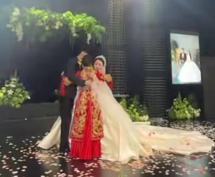 新郎站在台上,眼眶泛红,眼泪擦了又擦,表情紧张又复杂。新娘倒是挺沉得住气,全程笑吟吟的,配合着婆婆的演出,鼓掌、互动,一个不落
