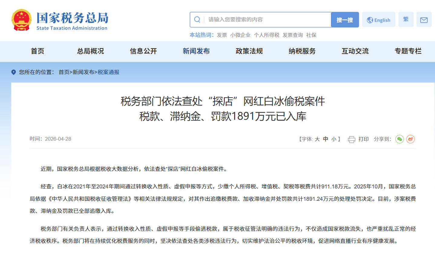 4月28日,国家税务总局发布消息,根据税收大数据分析,依法查处“探店”网红白冰偷税案件。