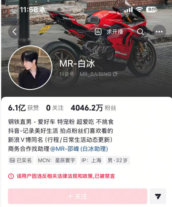 4月28日,红星新闻记者查询发现,网红白冰的抖音、微博、小红书、B站等账号已被禁止关注。此外,多平台显示“因违反相关法律法规和政策,已被禁言”。27日,网红白冰还在社交平台晒照,配文:“整装就绪暂别琐碎奔赴山海”。