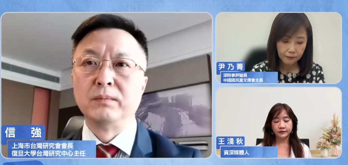 今晚“两岸圆桌派”的节目,岛内国民党“文传会主委”尹乃菁连线信强教授。