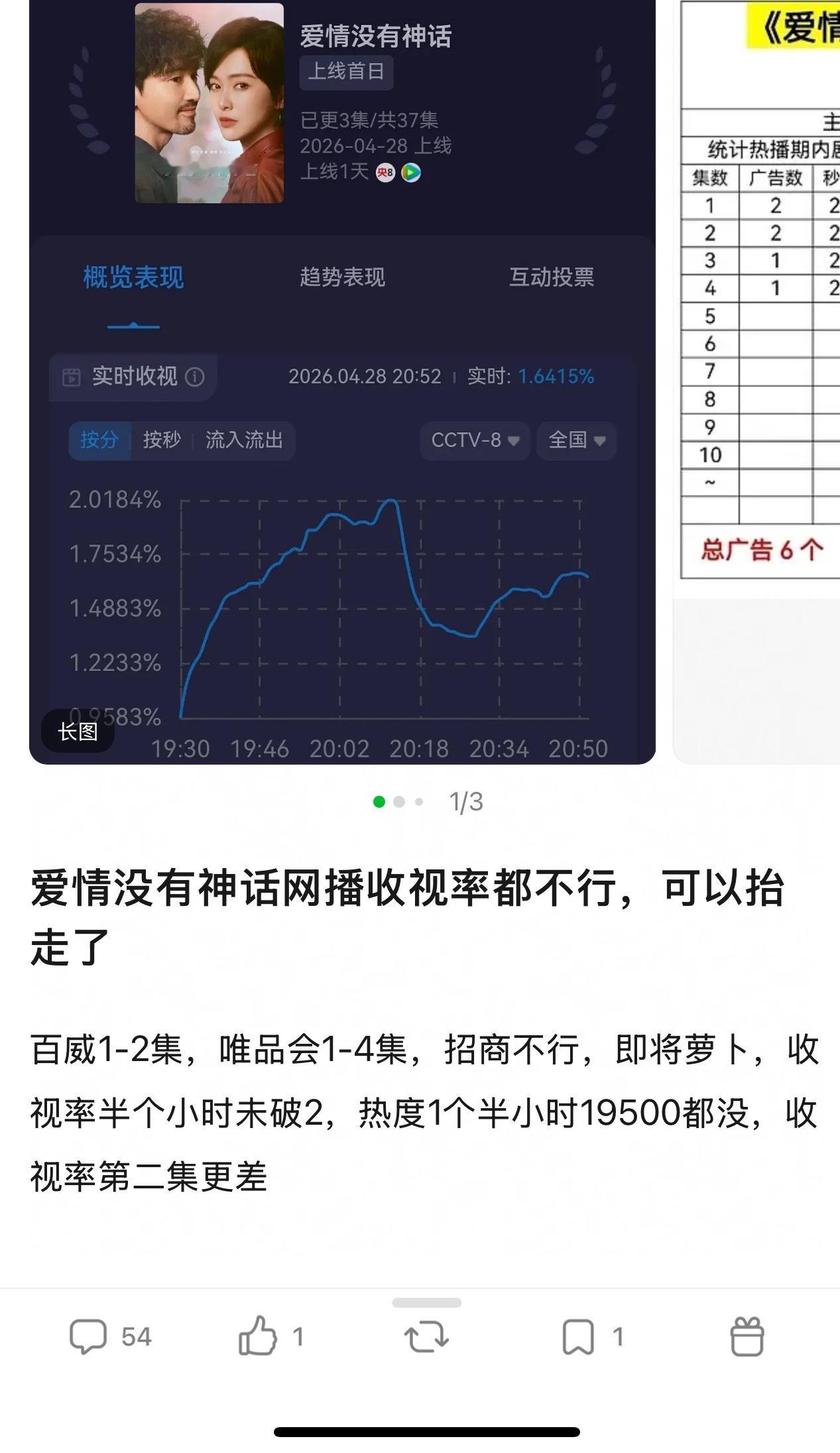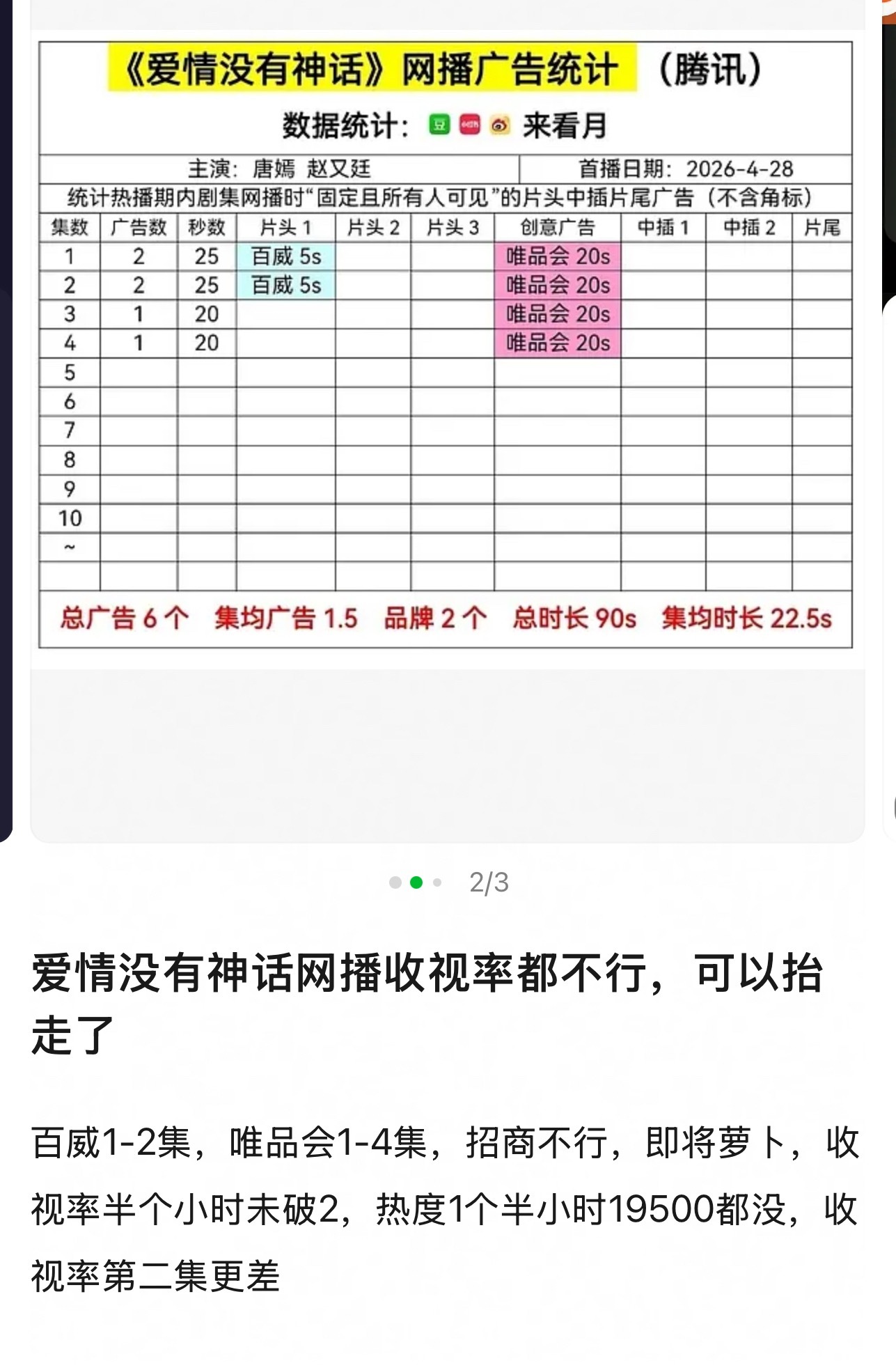 爱情没有神话口碑不佳,目前看了的评价主要集中在女主假发很出戏、滤镜不好、剧情悬浮,从收视率、网播和招商来看,不如朱珠和钟汉良的蜜语纪,新丽大剧再次滑铁卢不是意外,编剧秦雯导致的路人盘下滑和剧本身的问题太多了,这么一来,其他85花可以放心了,首播口碑很关键,目前来看基本宣告扑街。