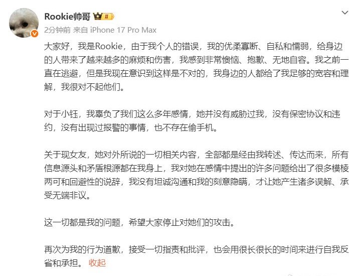 尘埃落定!小钰是被冤枉的,Rookie发文:小钰,我辜负了我们这么多年感情,她并没有威胁过我,没有保密协议和违约,没有出现过报警的事情,也不存在偷手机。