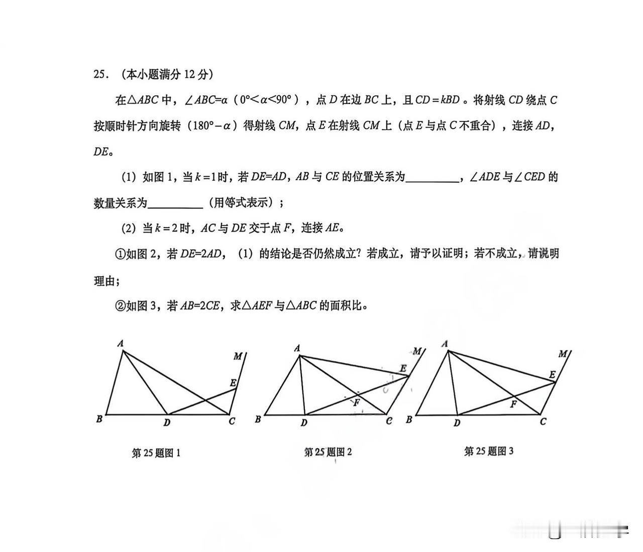 第25题第二问,延长一下ED,交AB的延长线于K,三角形CDE与三角形BDK相似,所以,DE等于两倍的DK,DK等于DA。利用三角形外角知识点,角ADE等于两倍的角K等于两倍的角CED。