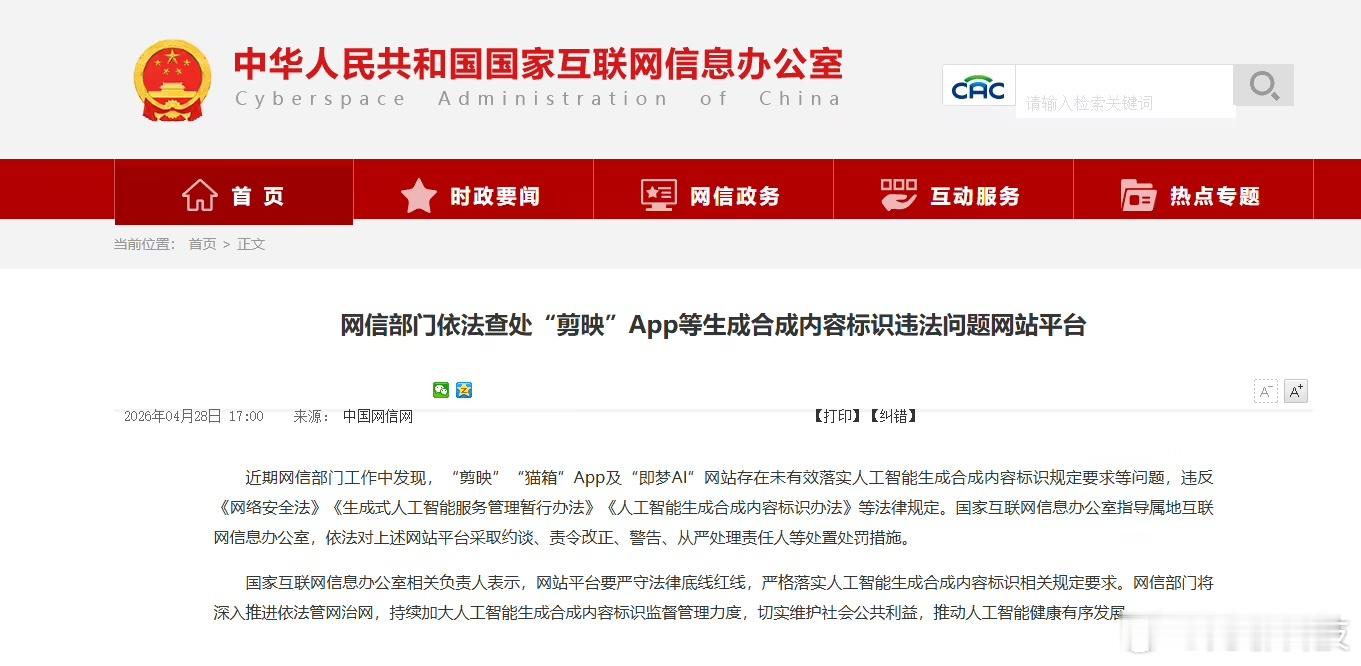 【剪映、猫箱、即梦 AI 等被查】近日,“剪映”“猫箱”App 及“即梦 AI”网站存在未有效落实人工智能生成合成内容标识规定要求等问题,违反《网络安全法》《生成式人工智能服务管理暂行办法》《人工智能生成合成内容标识办法》等法律规定。互联网信息办公室依法对上述网站平台采取约谈、责令改正、警告、从严处理责任人等处置处罚措施。剪映被查有点东西